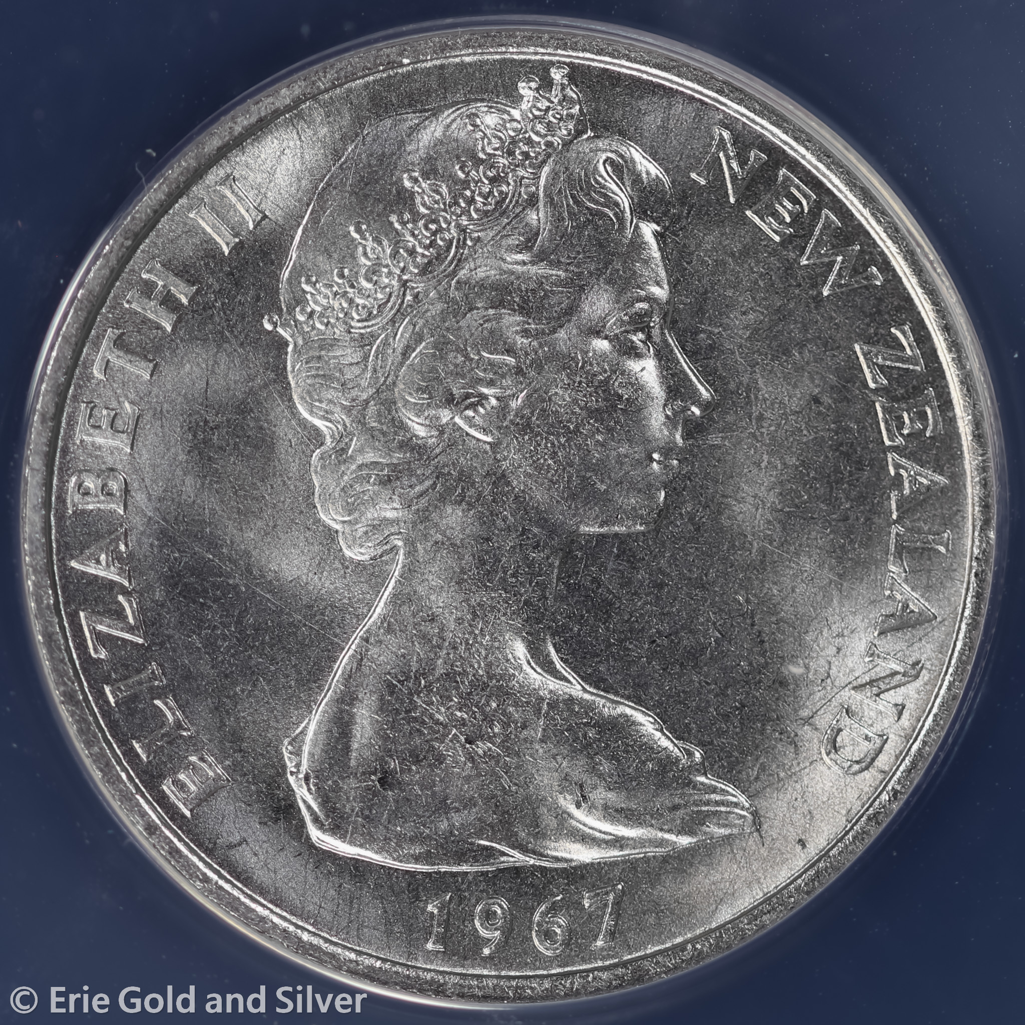 For sale is a 1967 New Zealand Elizabeth II 10 Cents. Certified / graded by ANACS at MS 67.