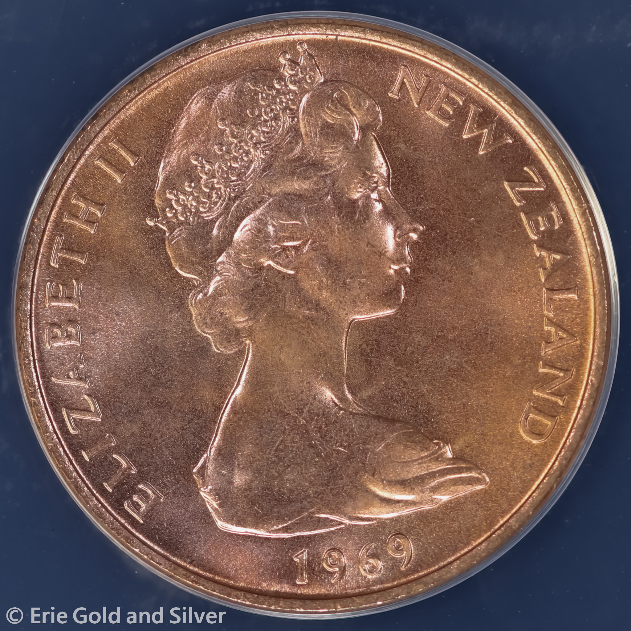 For sale is a 1969 New Zealand Elizabeth II 2 Cents. Certified / graded by ANACS at MS 67 Red.