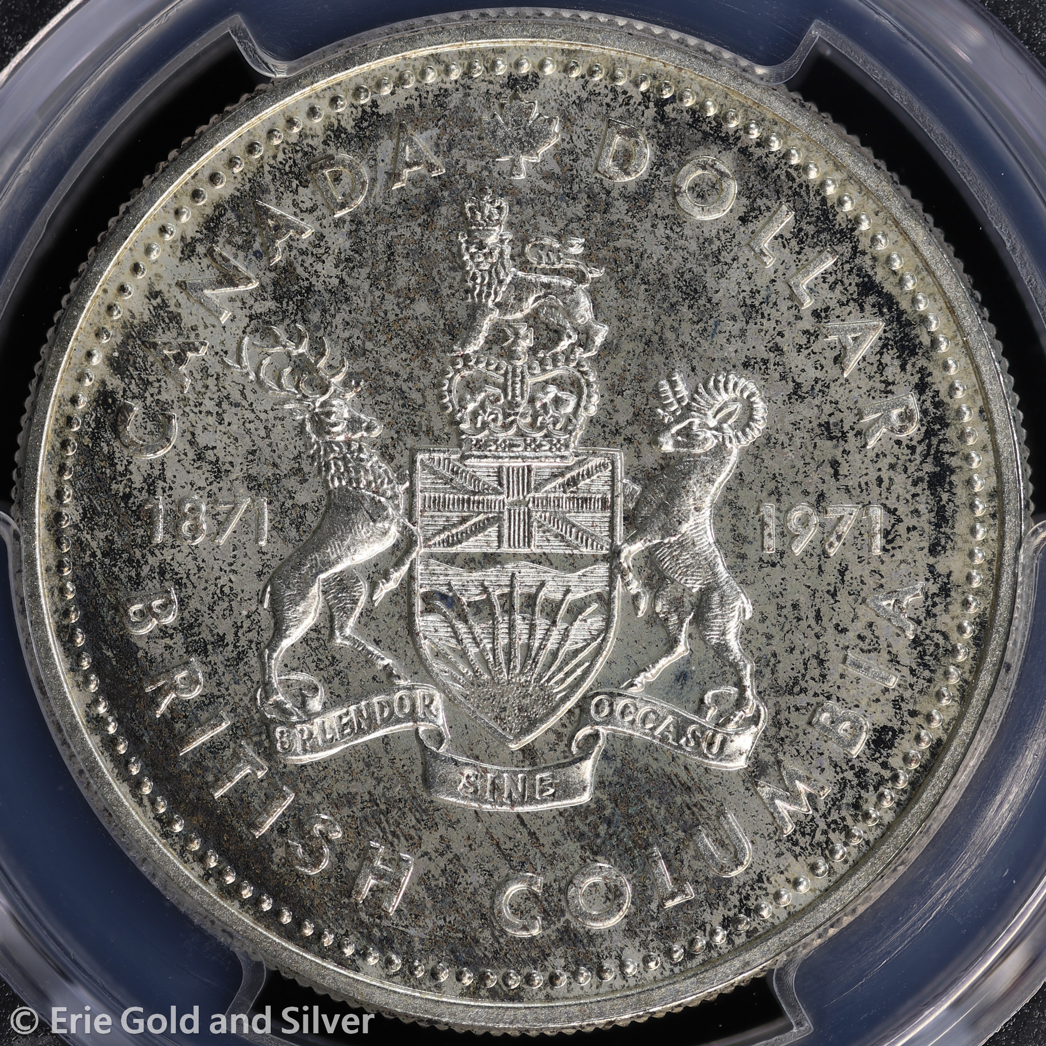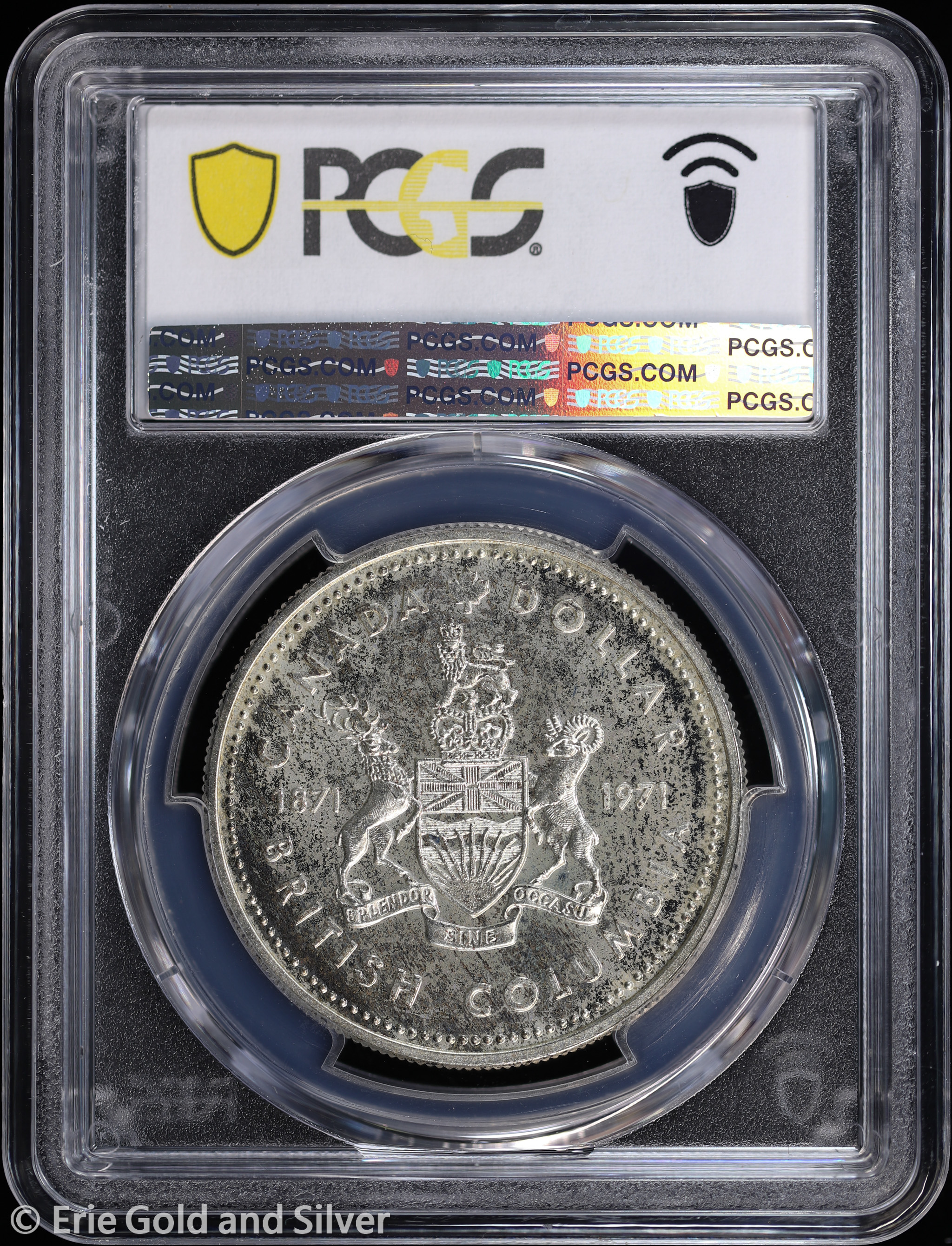 For sale is a 1971 $1 Canada British Columbia Silver Dollar. Certified / graded by PCGS at SP 67.
