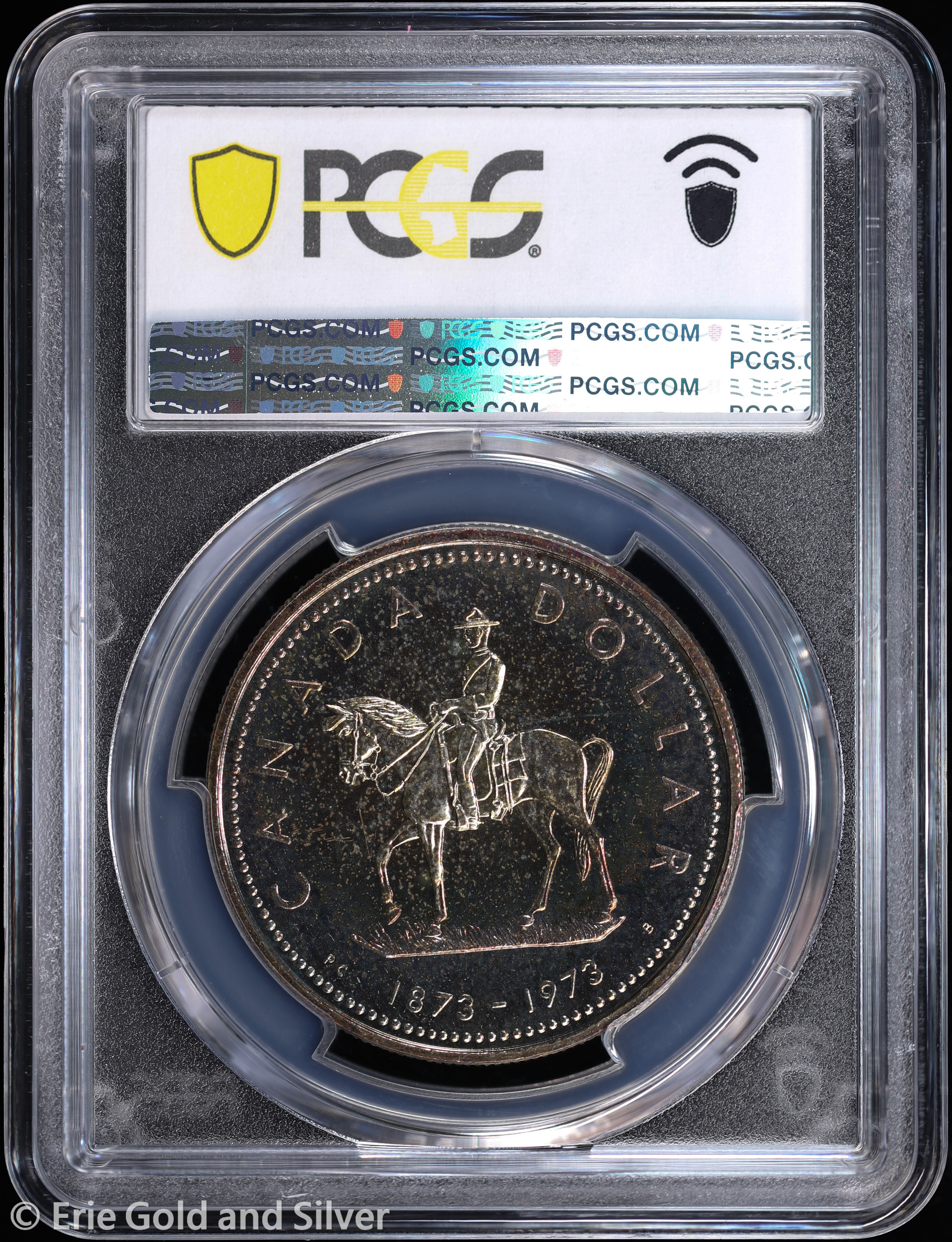 For sale is a 1973 $1 Canada Royal Canadian Mounted Police Silver Dollar. Certified / graded by PCGS at SP 67.
