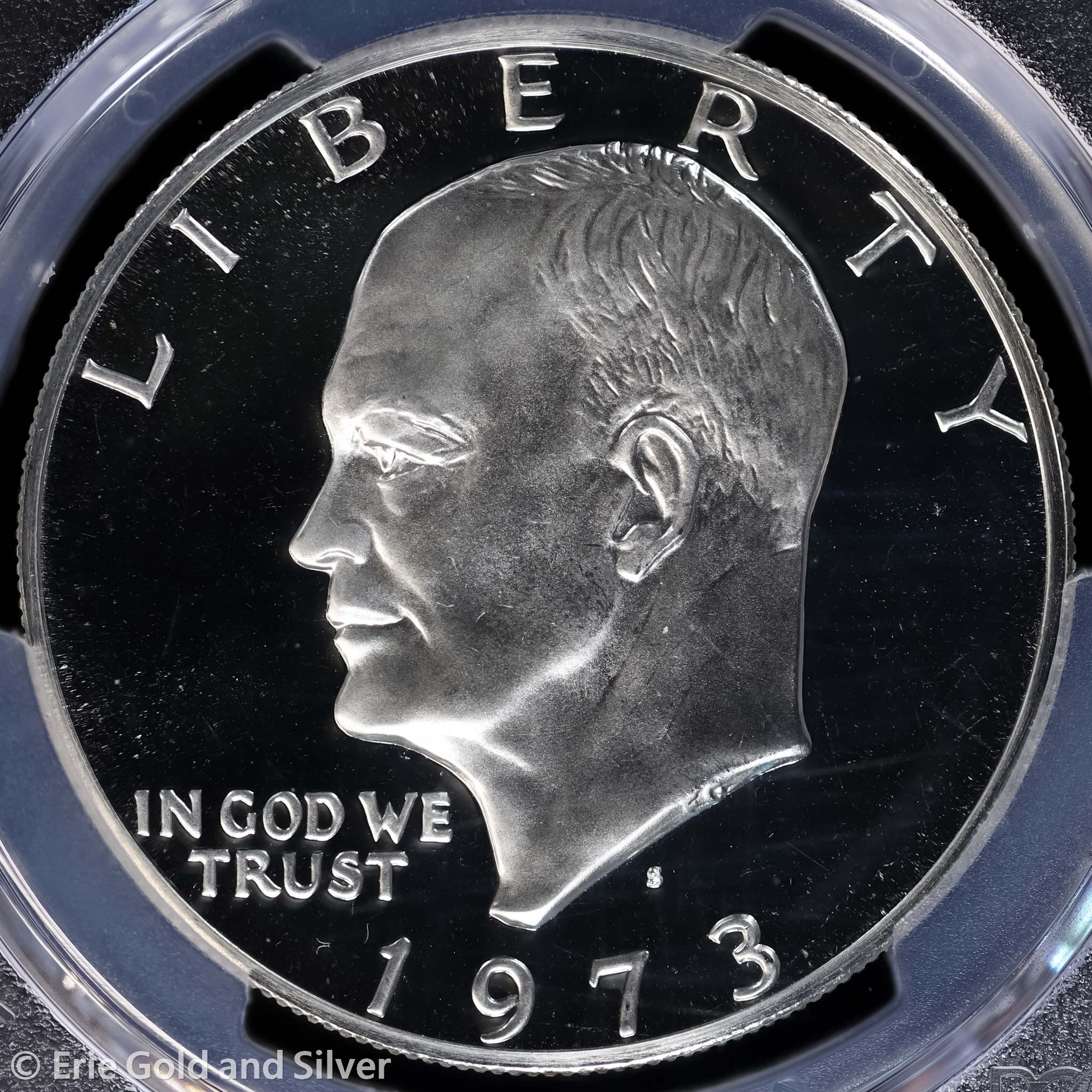 For sale is a 1973-S Proof Eisenhower "Ike" Silver Dollar. Certified / graded by PCGS at PR 70 DCAM.