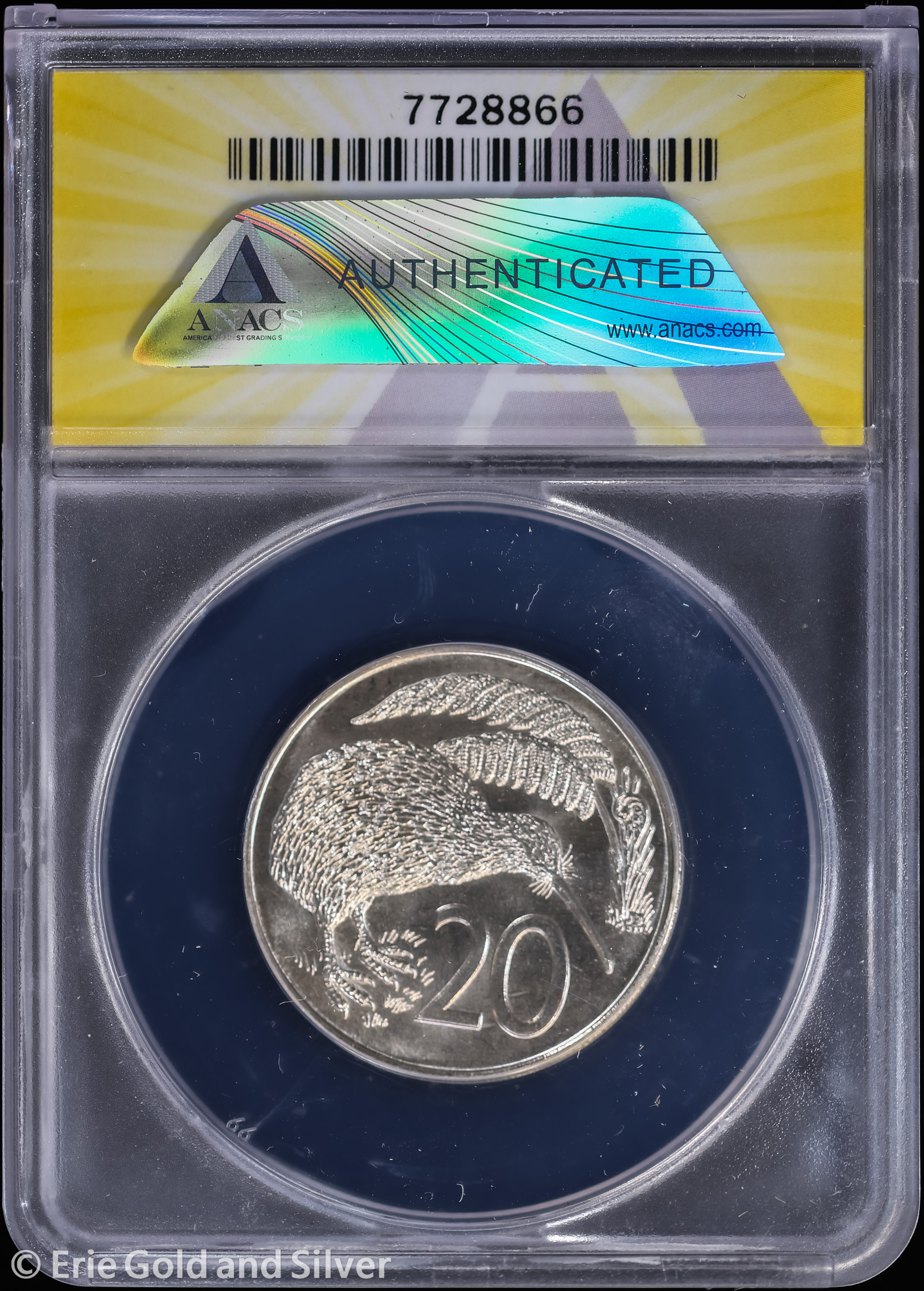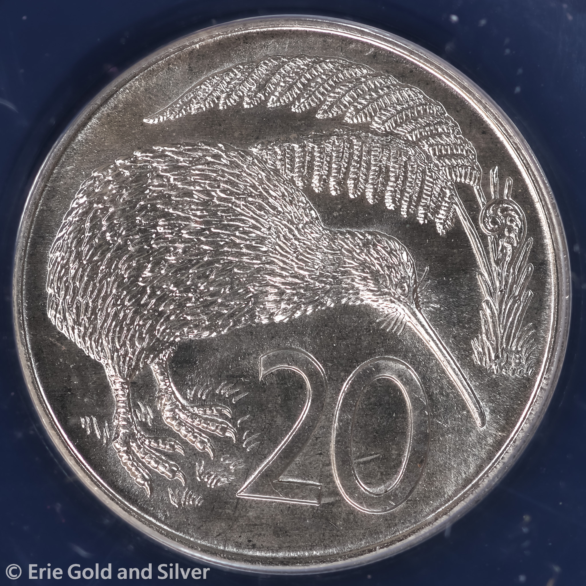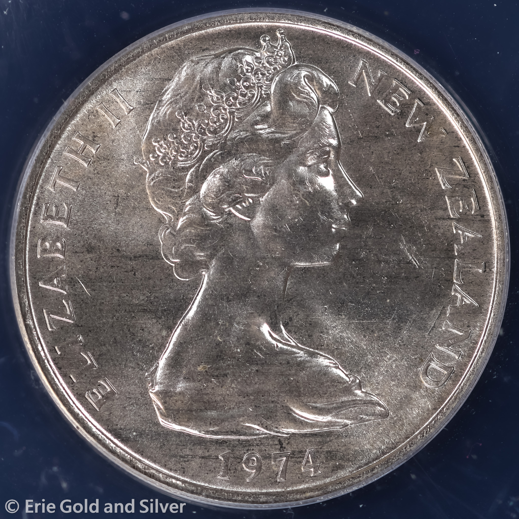 For sale is a 1974 New Zealand Elizabeth II 20 Cents. Certified / graded by ANACS at MS 67.