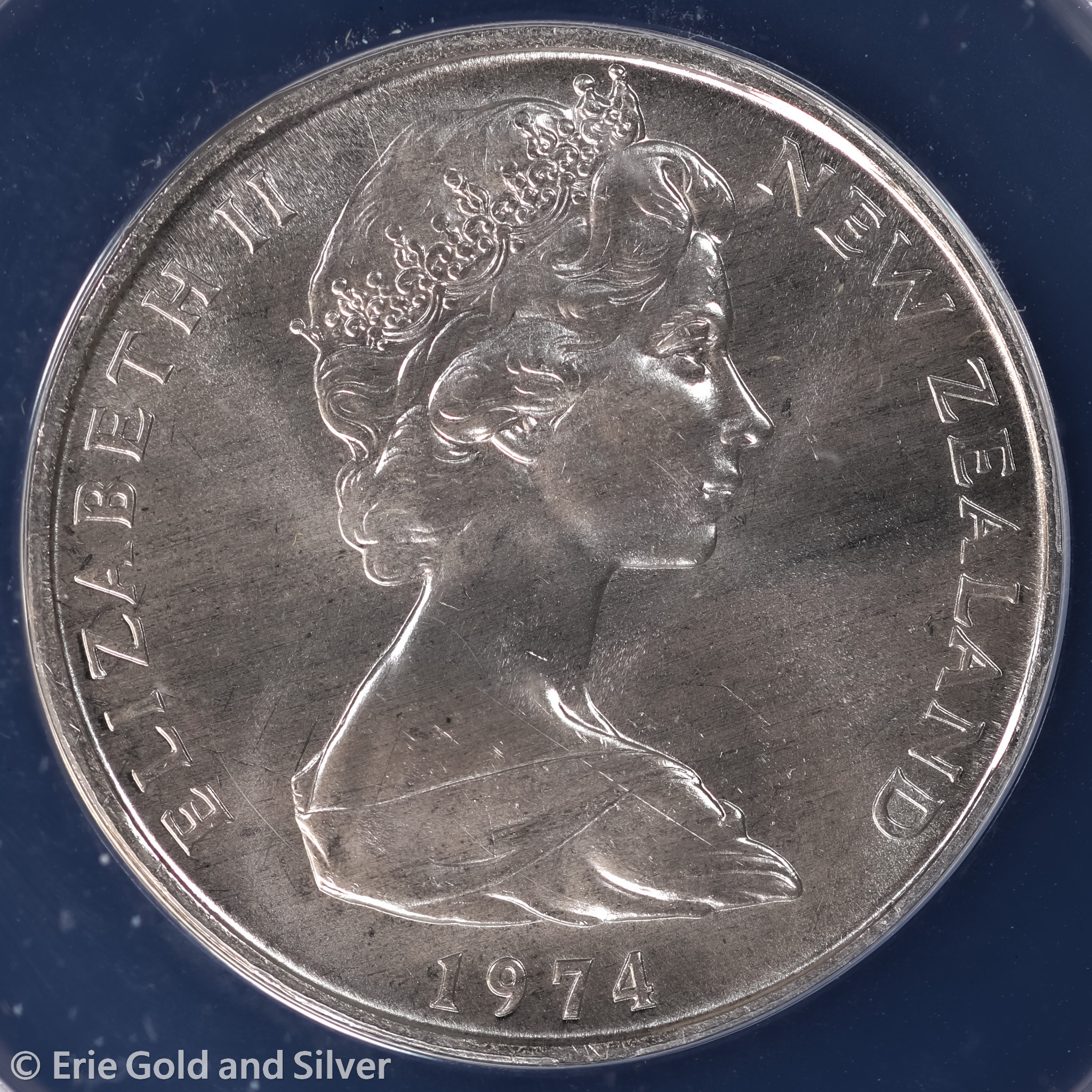 For sale is a 1974 New Zealand Elizabeth II 50 Cents. Certified / graded by ANACS at MS 67.