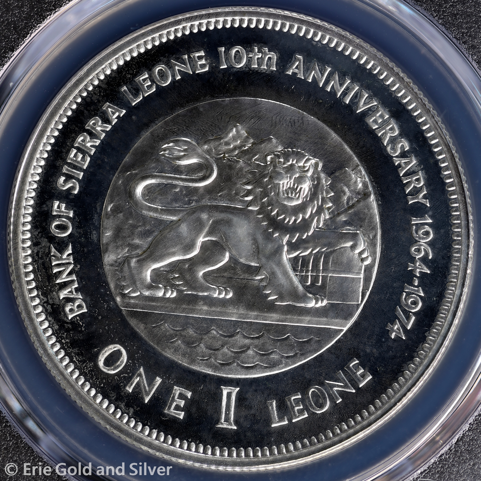 For sale is a 1974 Bank of Sierra Leone 10th Anniversary Commemorative Silver Proof Coin. Certified / graded by PCGS at PR 66 CAM.