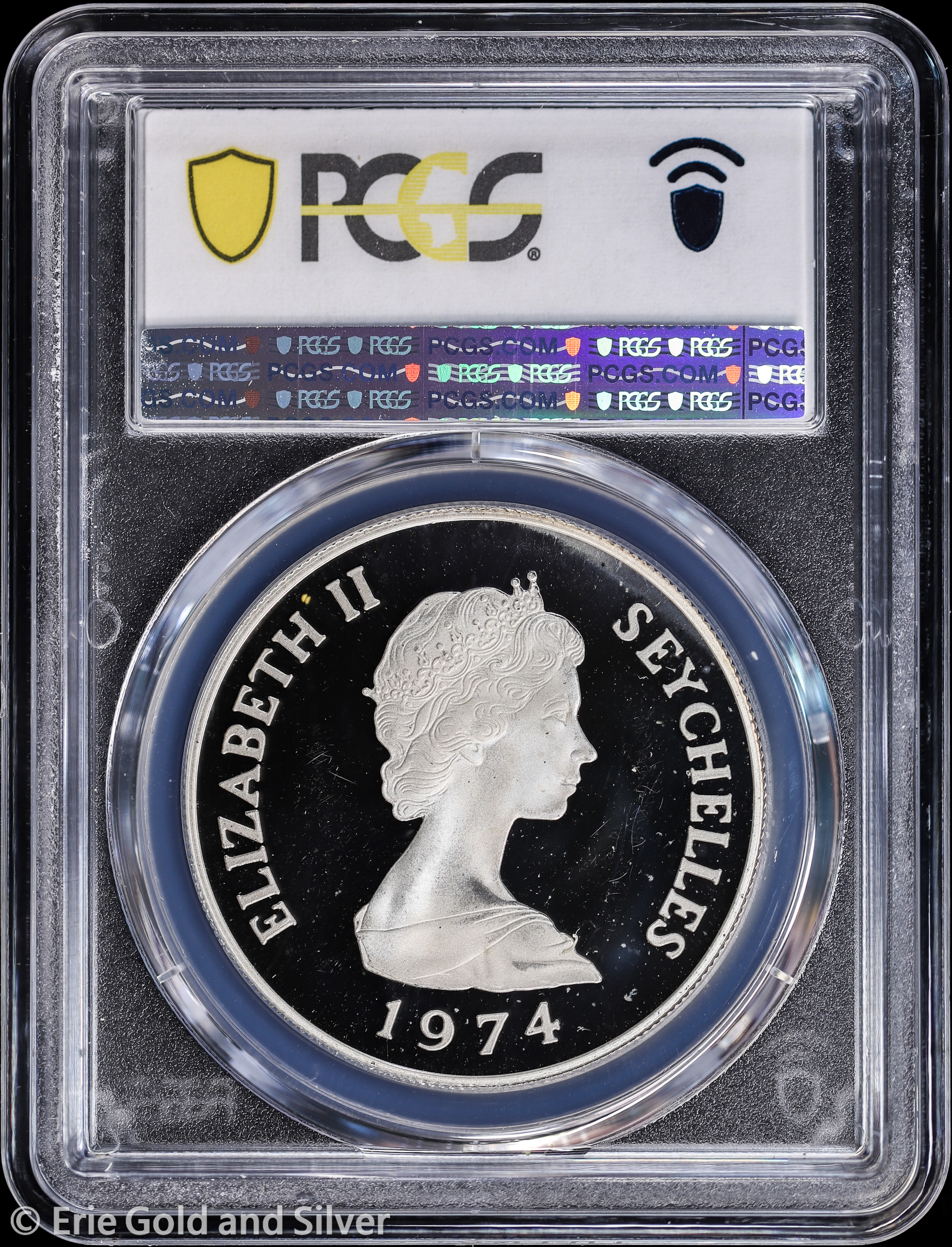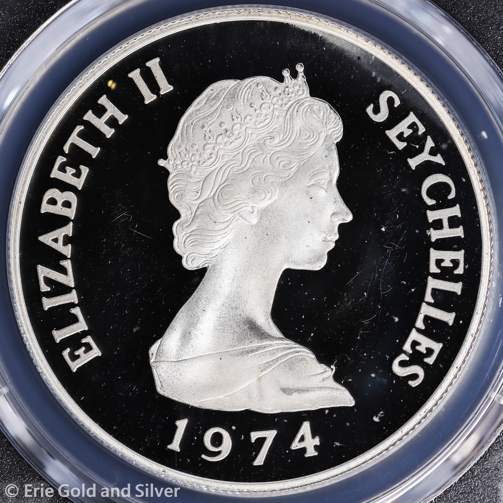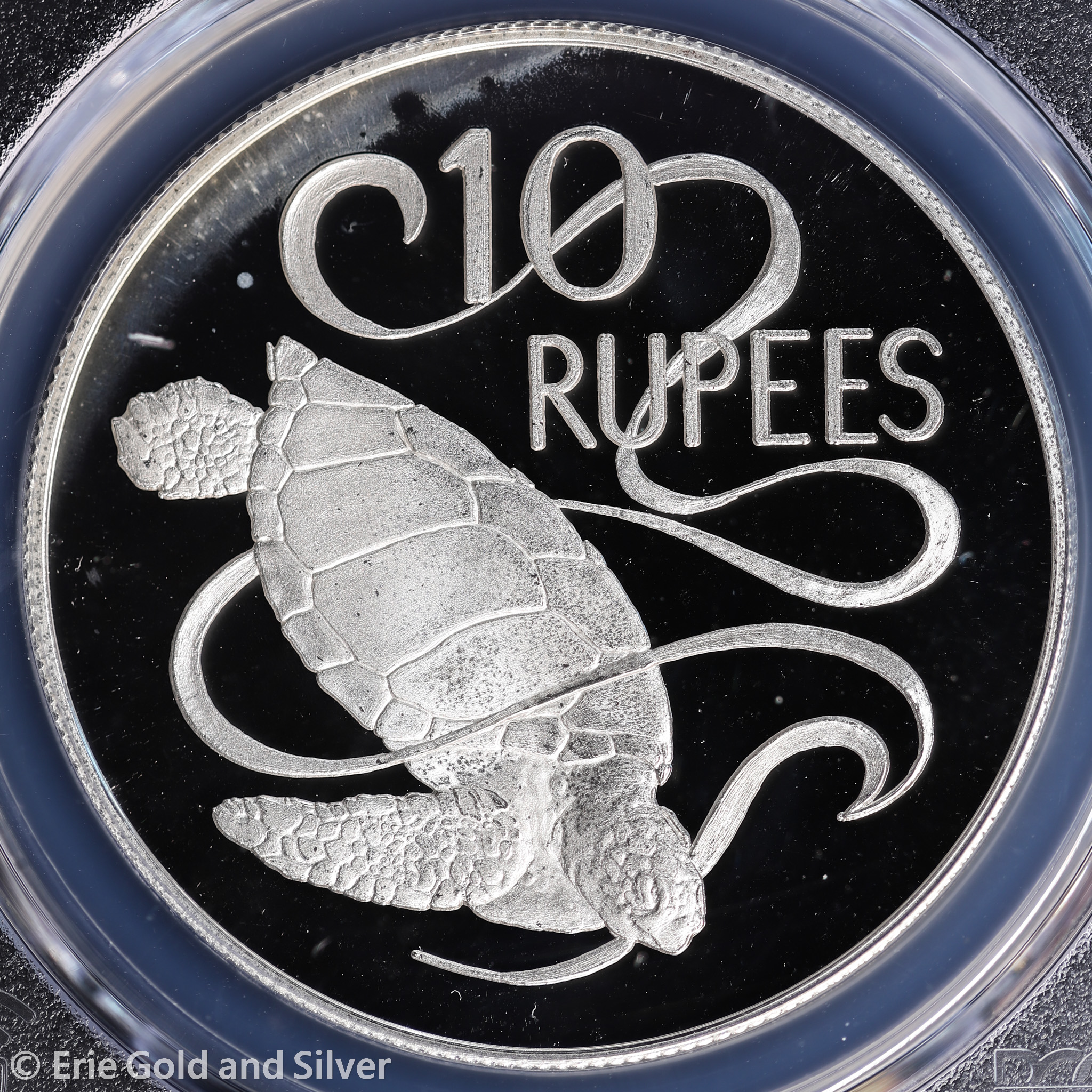 For sale is a 1974 Seychelles Sea Turtle Silver Proof 10 Rupees Coin. Certified / graded by PCGS at PR 66 DCAM.