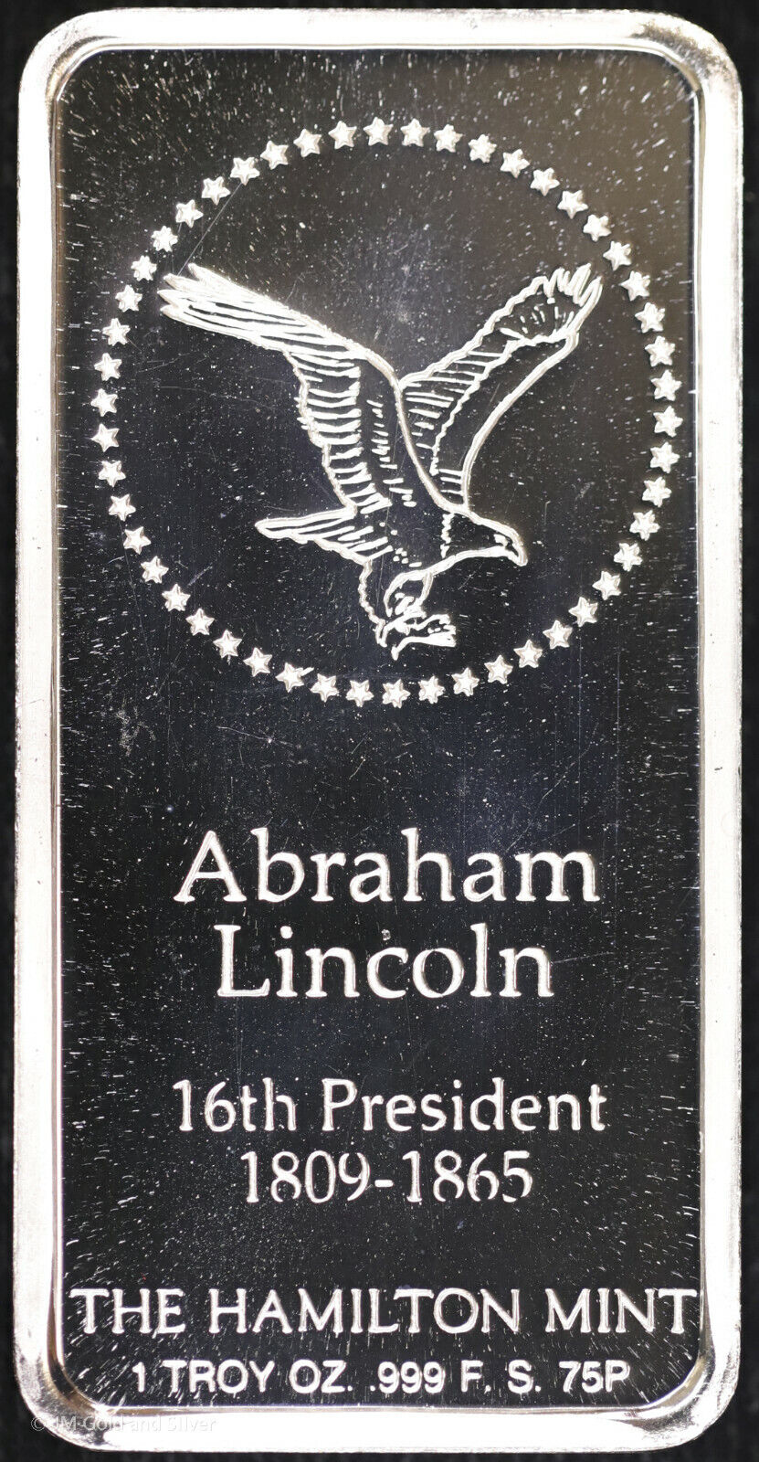 1975 Abraham Lincoln 16th U.S. President 1 oz .999 Silver Bar The Hamilton Mint