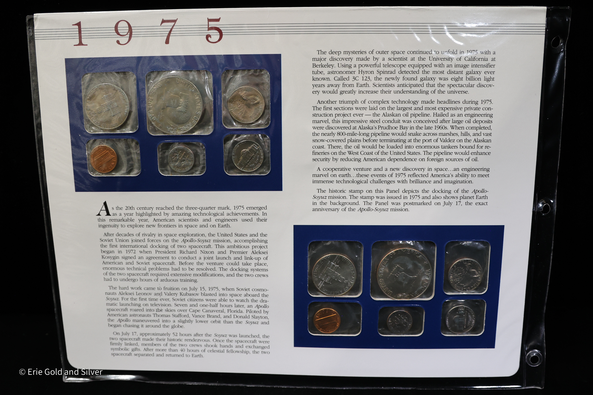 For sale is a 1975 P&D Uncirculated Mint Set Postal Commemorative Society Coins & Stamps panel for 3-ring binder.