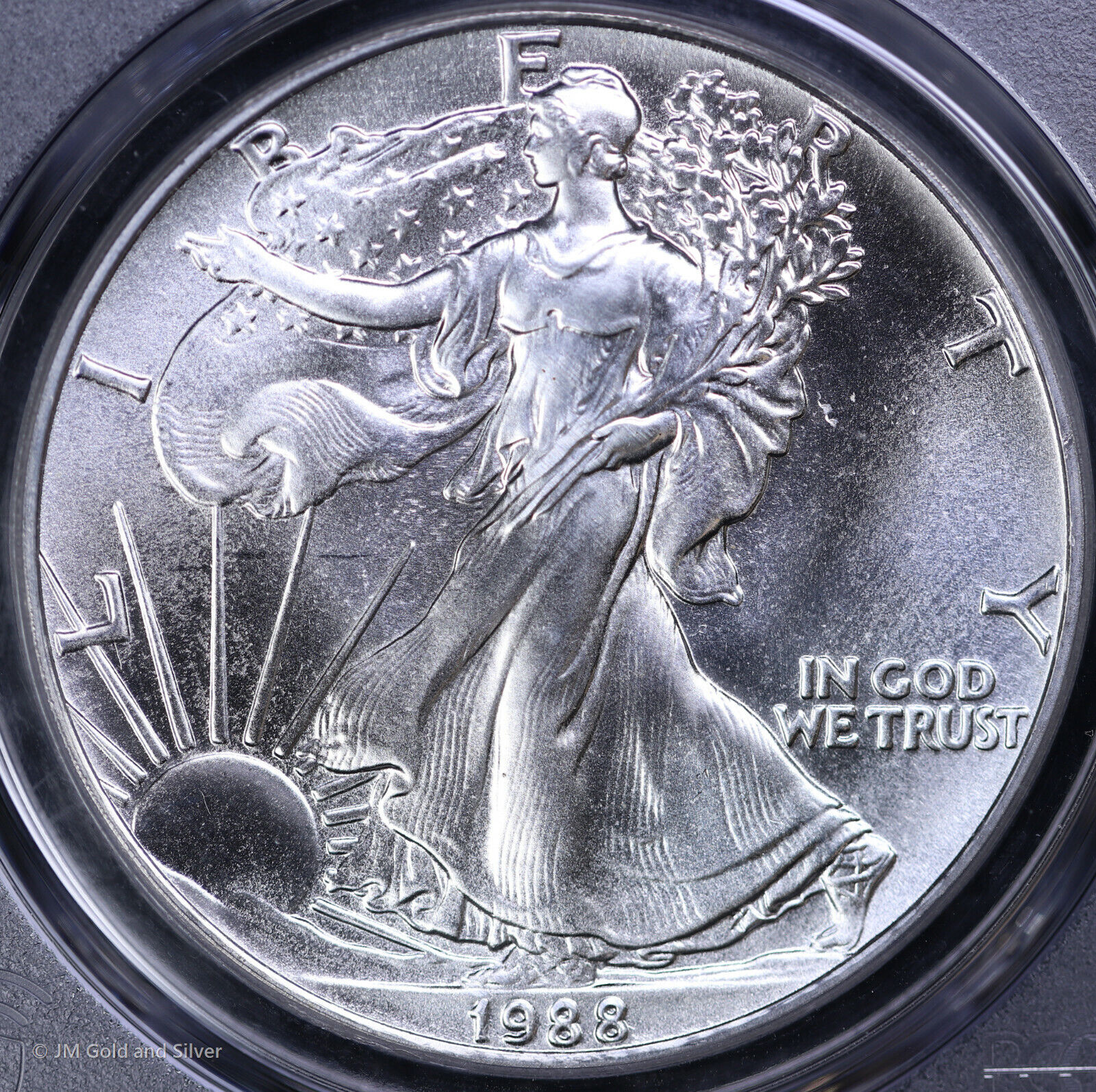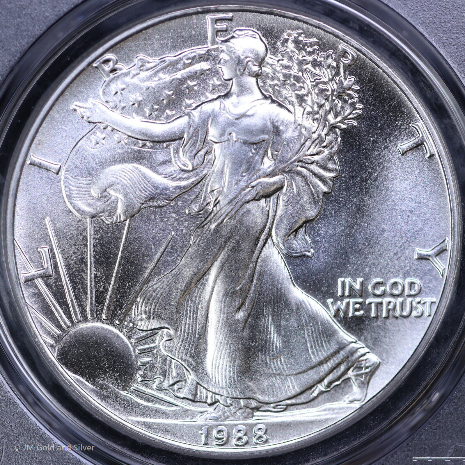 This 1988 American Silver Eagle is graded MS 69 by PCGS, showcasing near-perfect condition and brilliant luster. Struck in one troy ounce of .999 fine silver, it remains one of the most iconic and trusted bullion coins in the world.