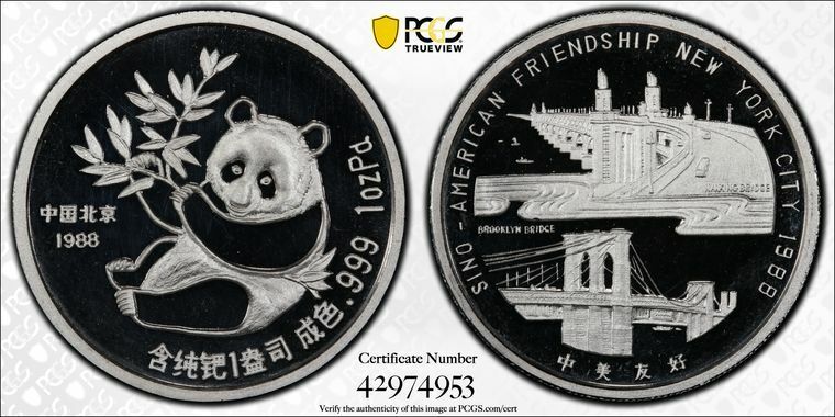 1988 China Palladium 1 Ounce Panda New York City Medal PCGS PR69 DCAM Top Pop
