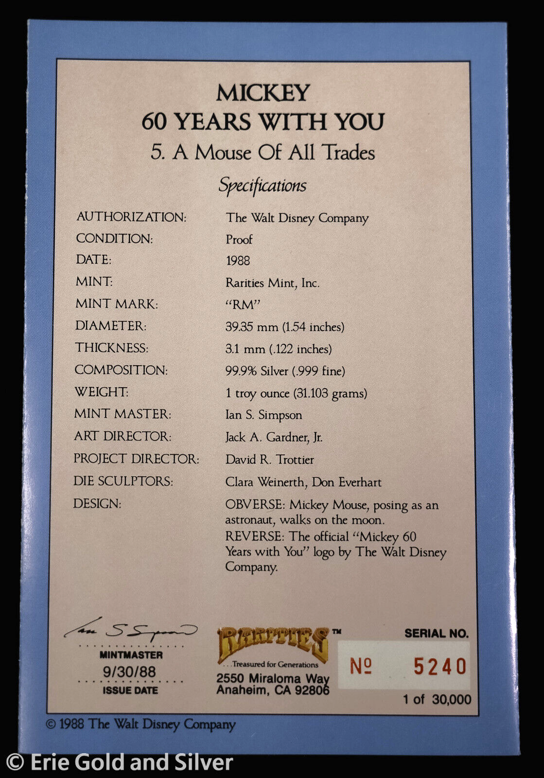 For sale is a 1988 Rarities Mint Mickey 60 Years With You #5 A Mouse of All Trades 1 oz Silver Proof Round with COA. View pictures for details and condition. The item pictured is the exact item you will receive. Feel free to contact us with any questions.
