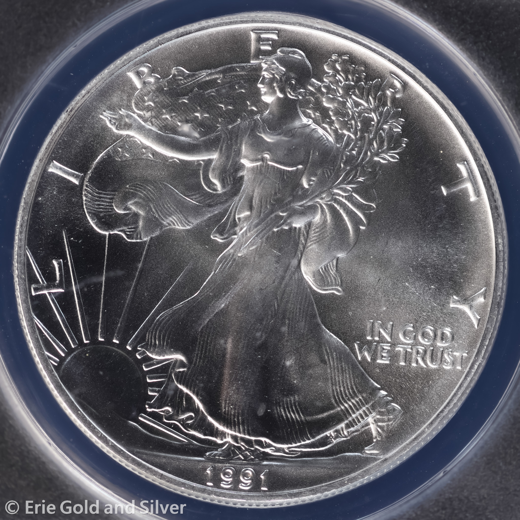 For sale is a 1991 American Silver Eagle. Certified / graded by ANACS at MS 70.