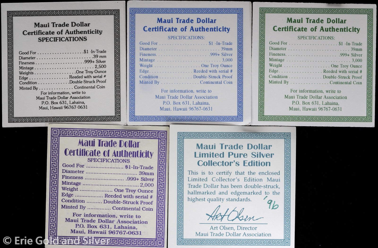 1992-1996 Maui Trade Dollar 1 oz Silver 5-Coin Collector's Set with Box & COA