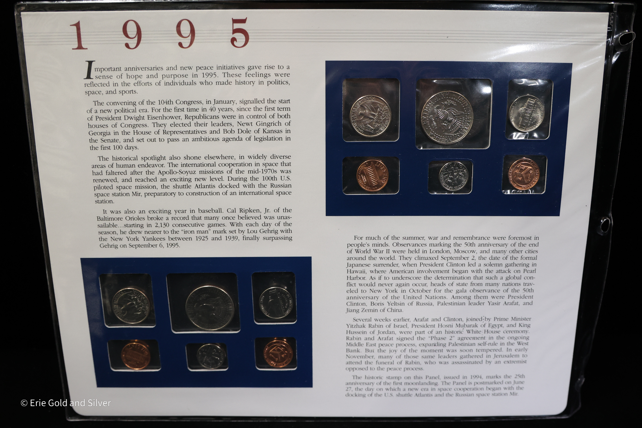 For sale is a 1995 P&D Uncirculated Mint Set Postal Commemorative Society Coins & Stamps panel for 3-ring binder.