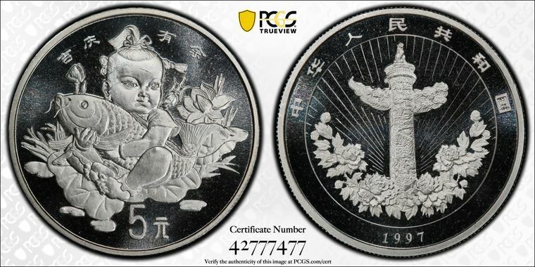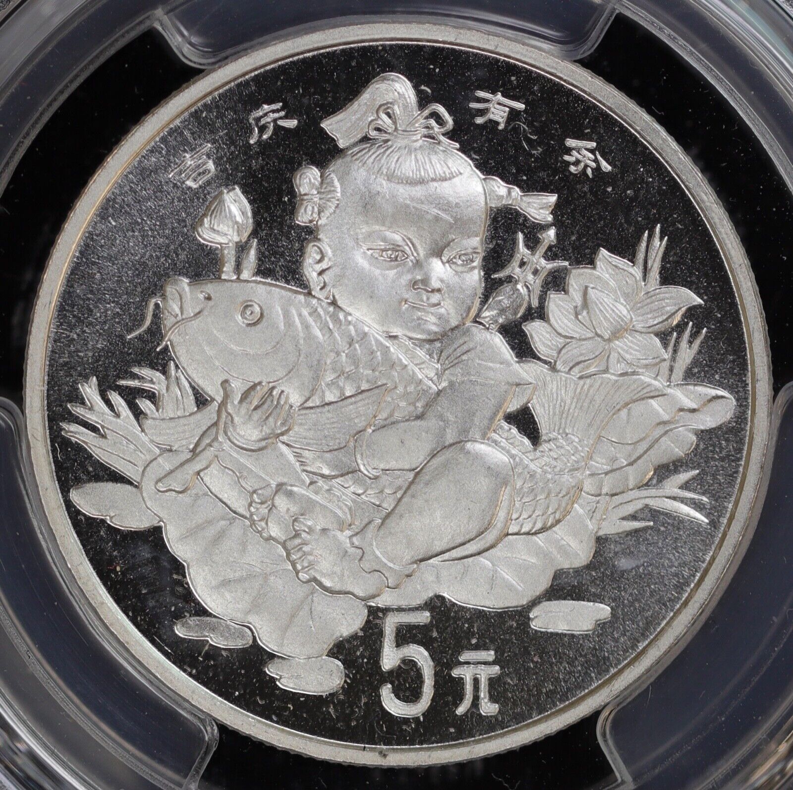 1997 China Silver 5 Yuan Auspicious Matters Child w/ Carp Piefort PCGS MS 67