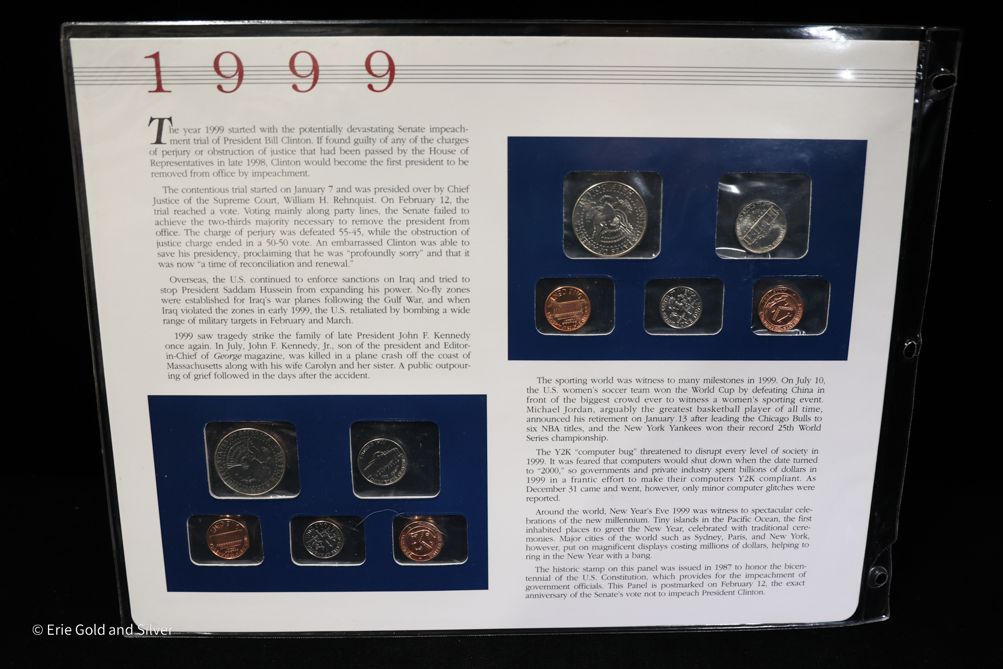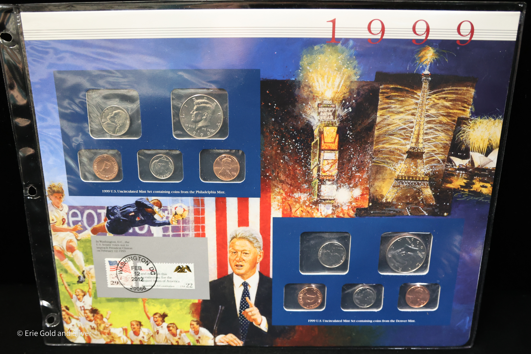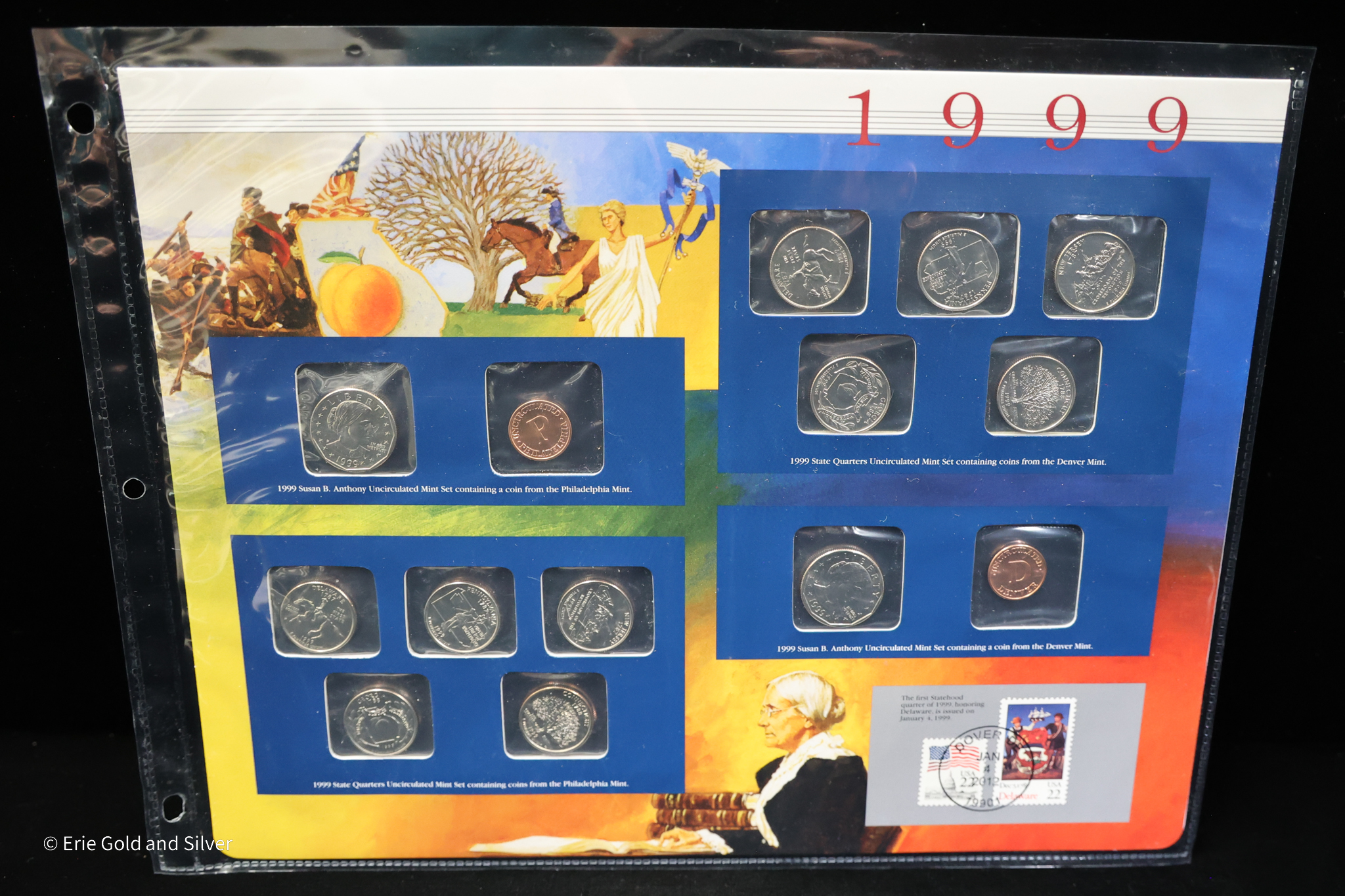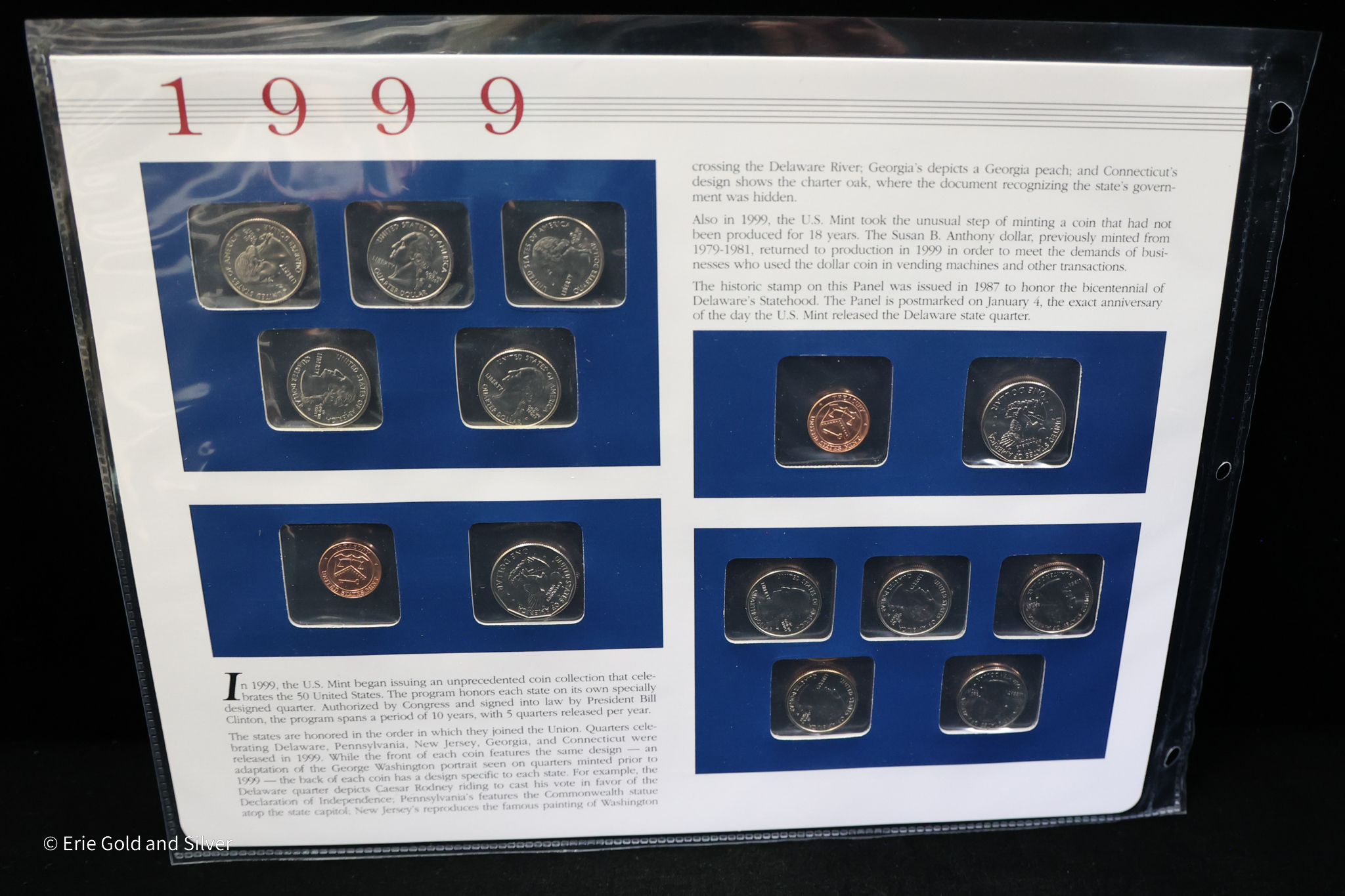 For sale is a 1999 P&D Uncirculated Mint Set Postal Commemorative Society Coins & Stamps panel for 3-ring binder.
