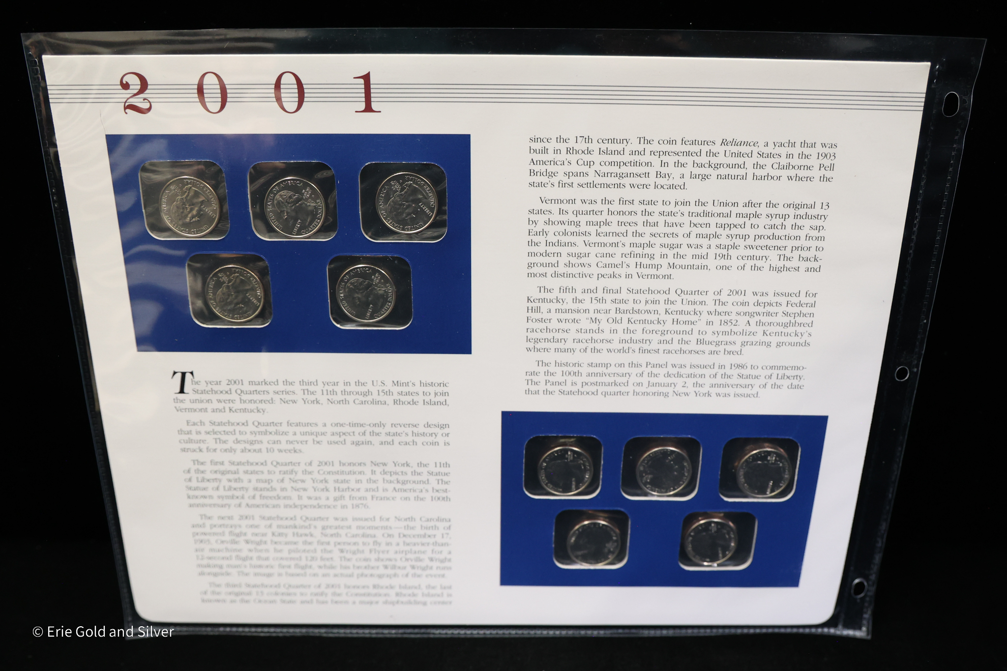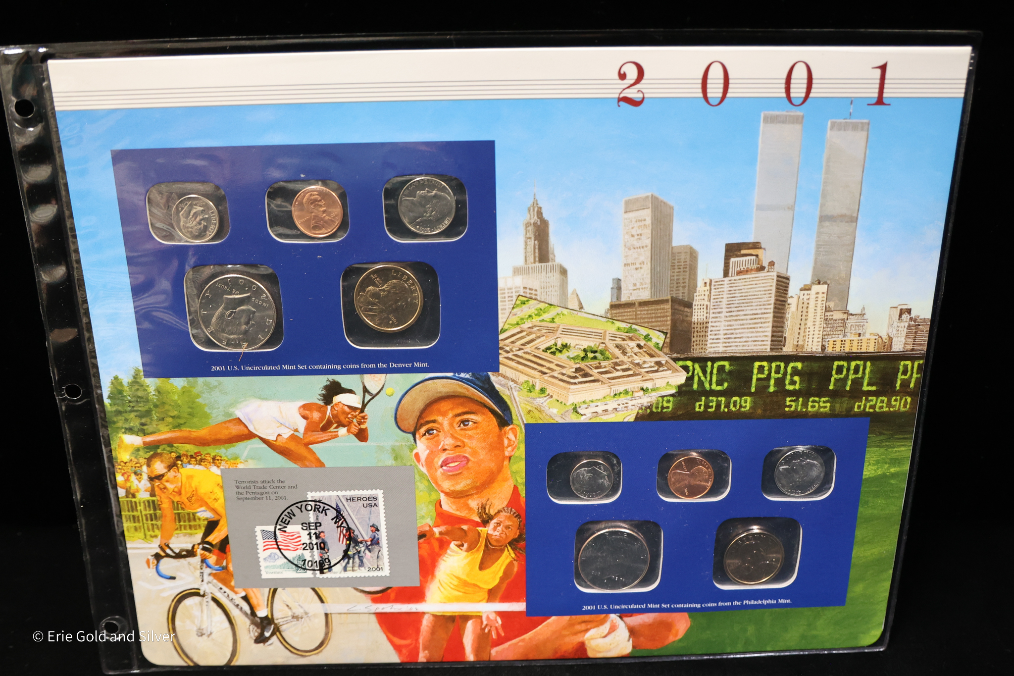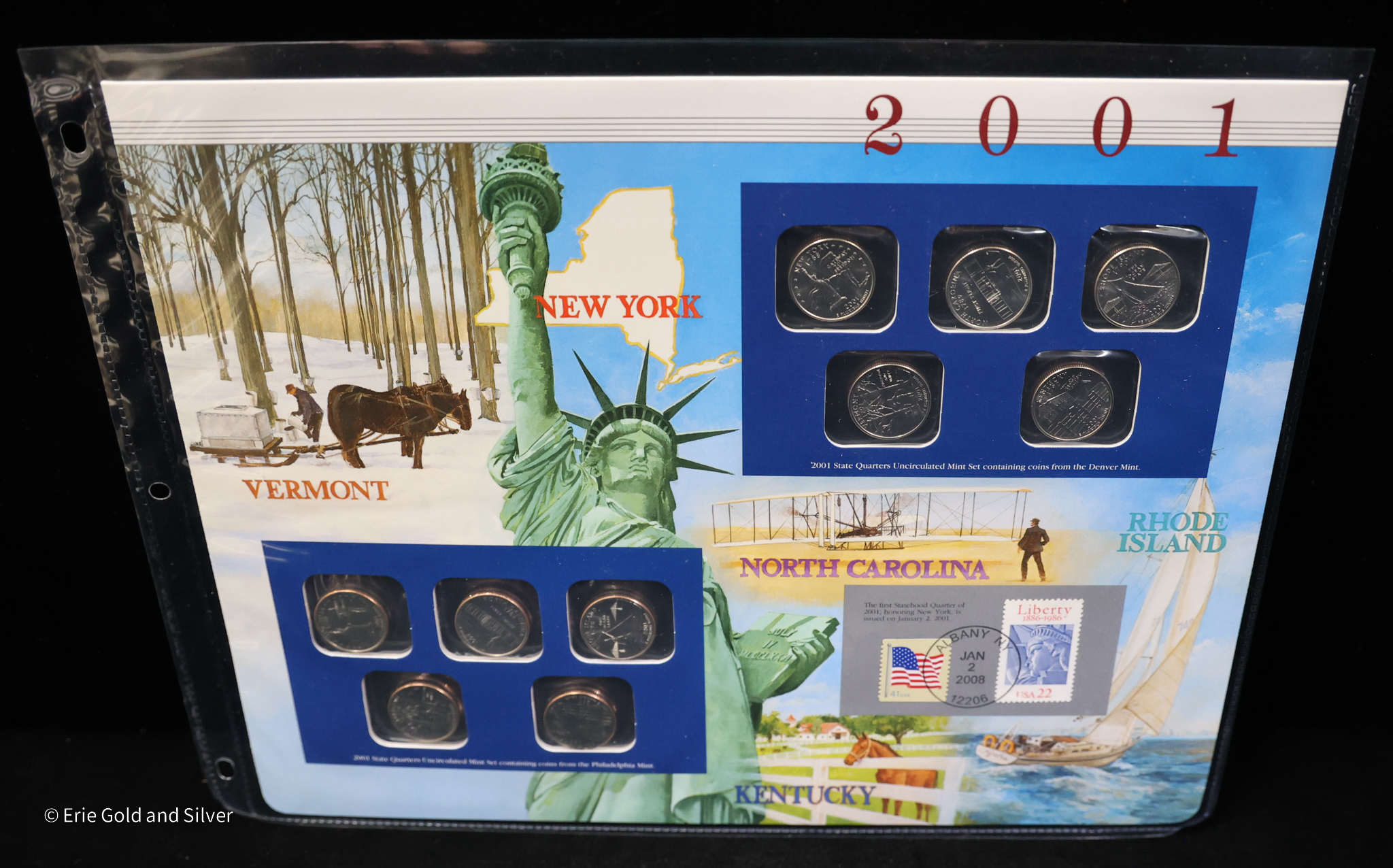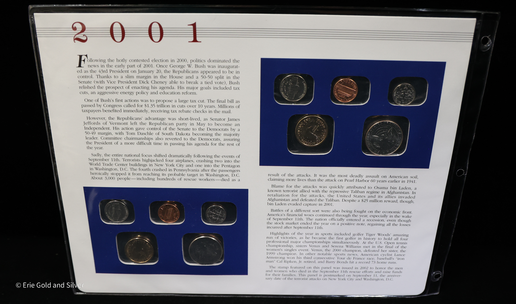 For sale is a 2001 P&D Uncirculated Mint Set Postal Commemorative Society Coins & Stamps panel for 3-ring binder.