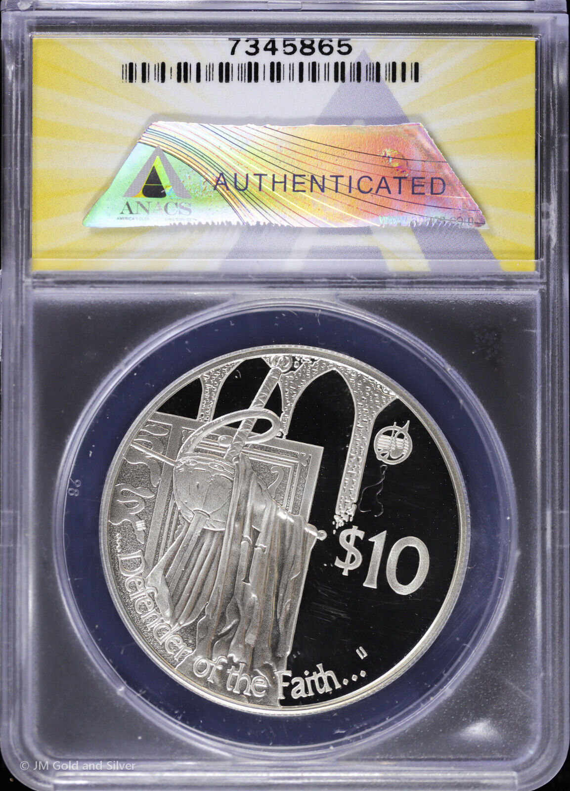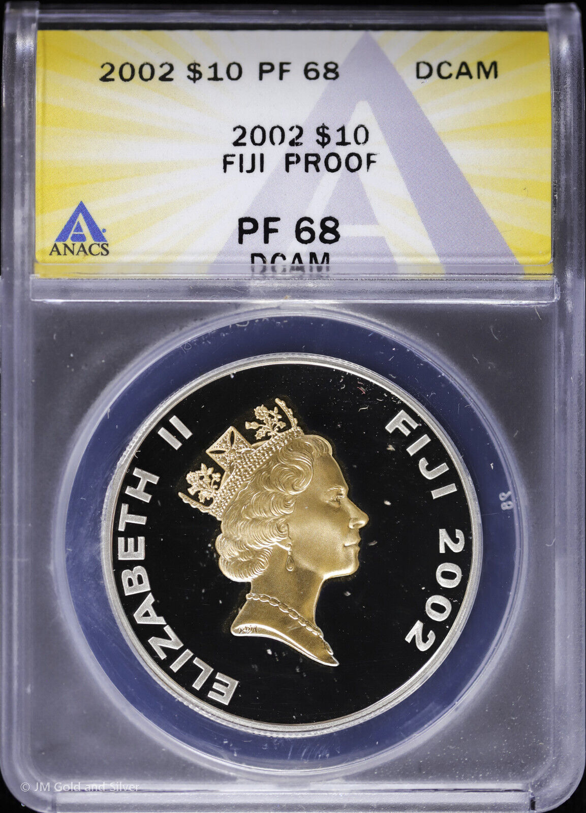 2002 $10 Fiji Proof Gilded Silver Dollar ANACS PF 68 DCAM Defender of the Faith