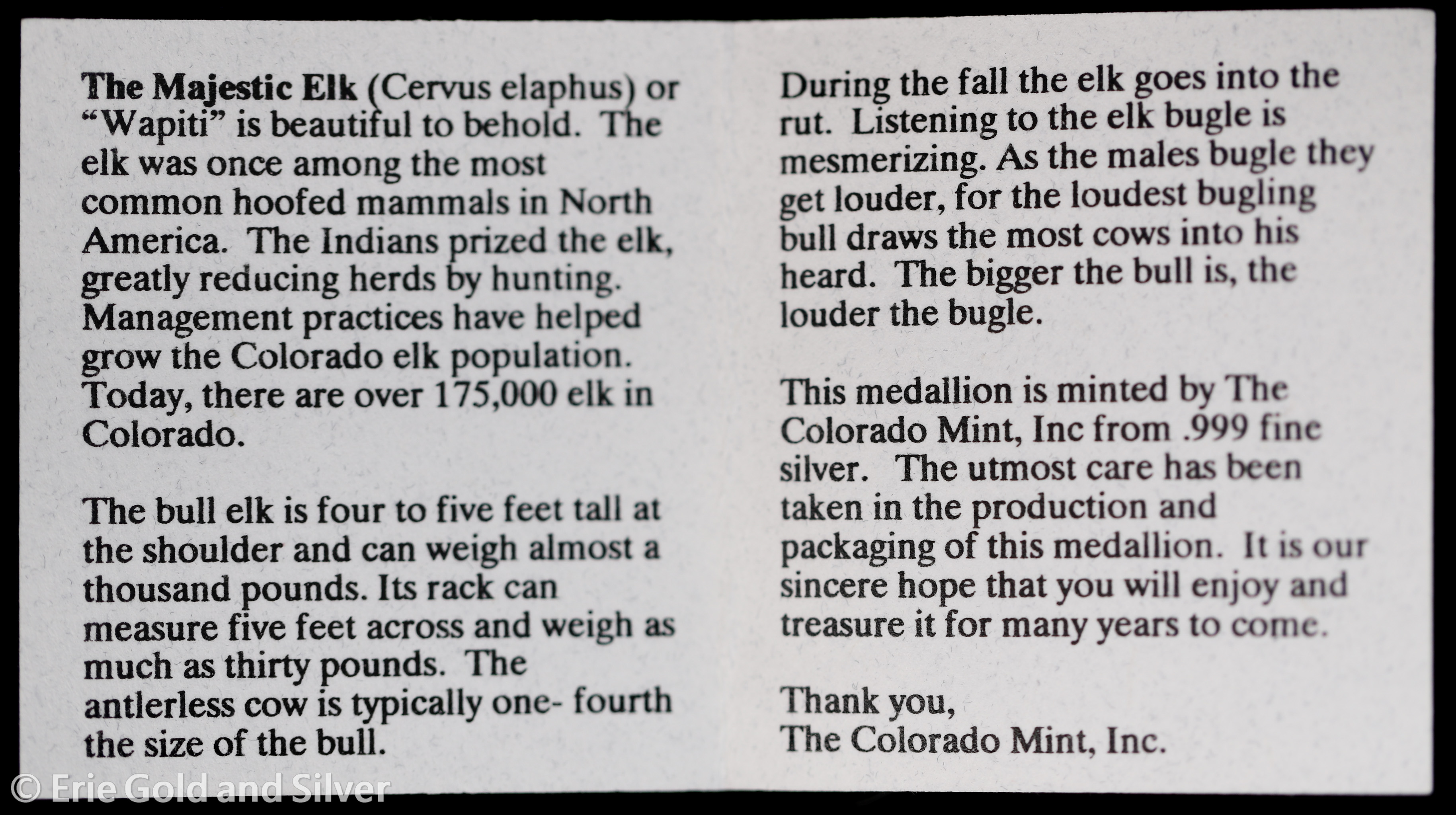 For sale is a 2002 Colorado Wildlife Majestic Elk Silver Medallion w/ Box & COA.