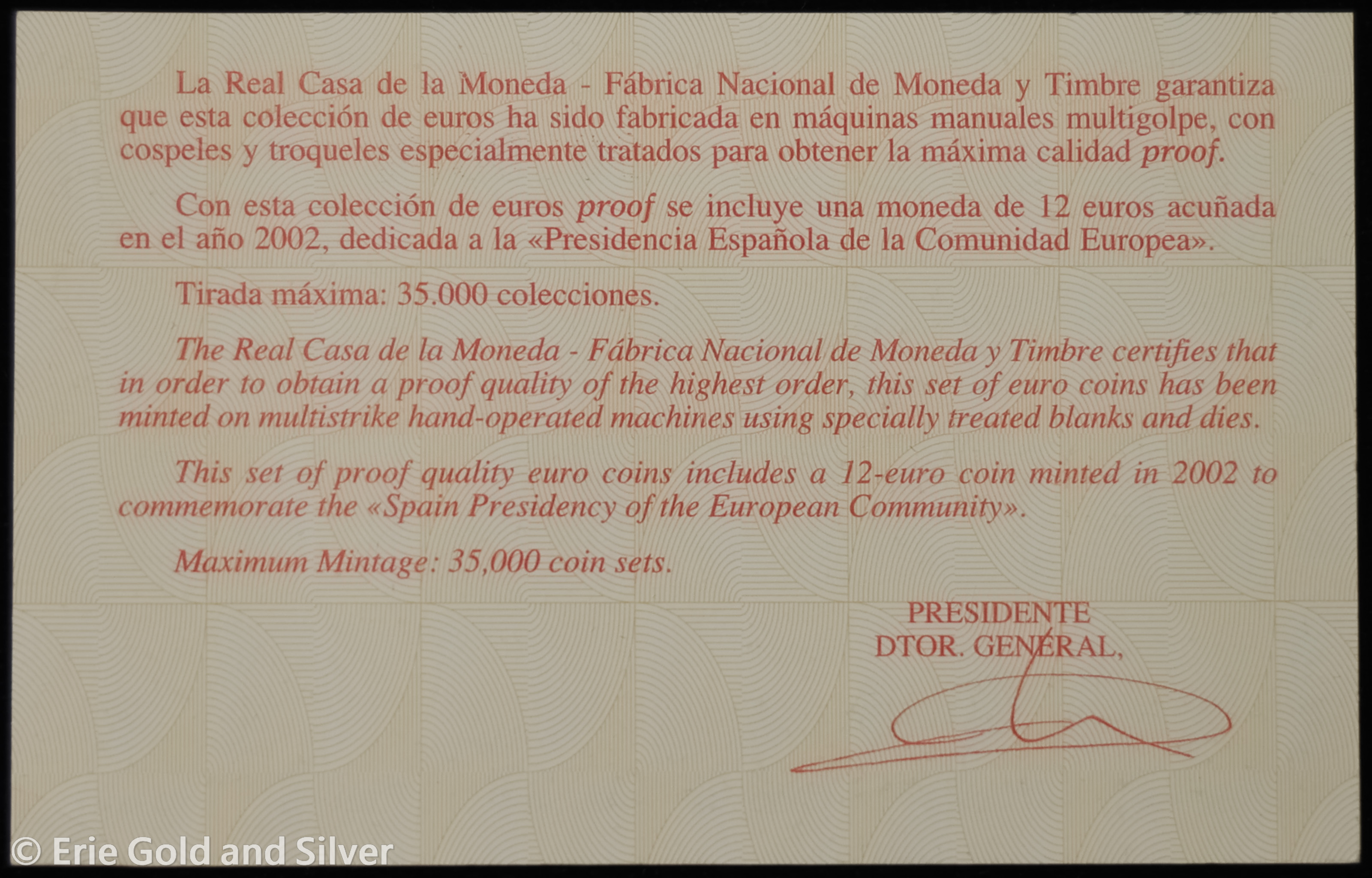 2002 Spain 8pc Proof Set + 12 Euro Commemorative Silver Coin w/ Box & COA