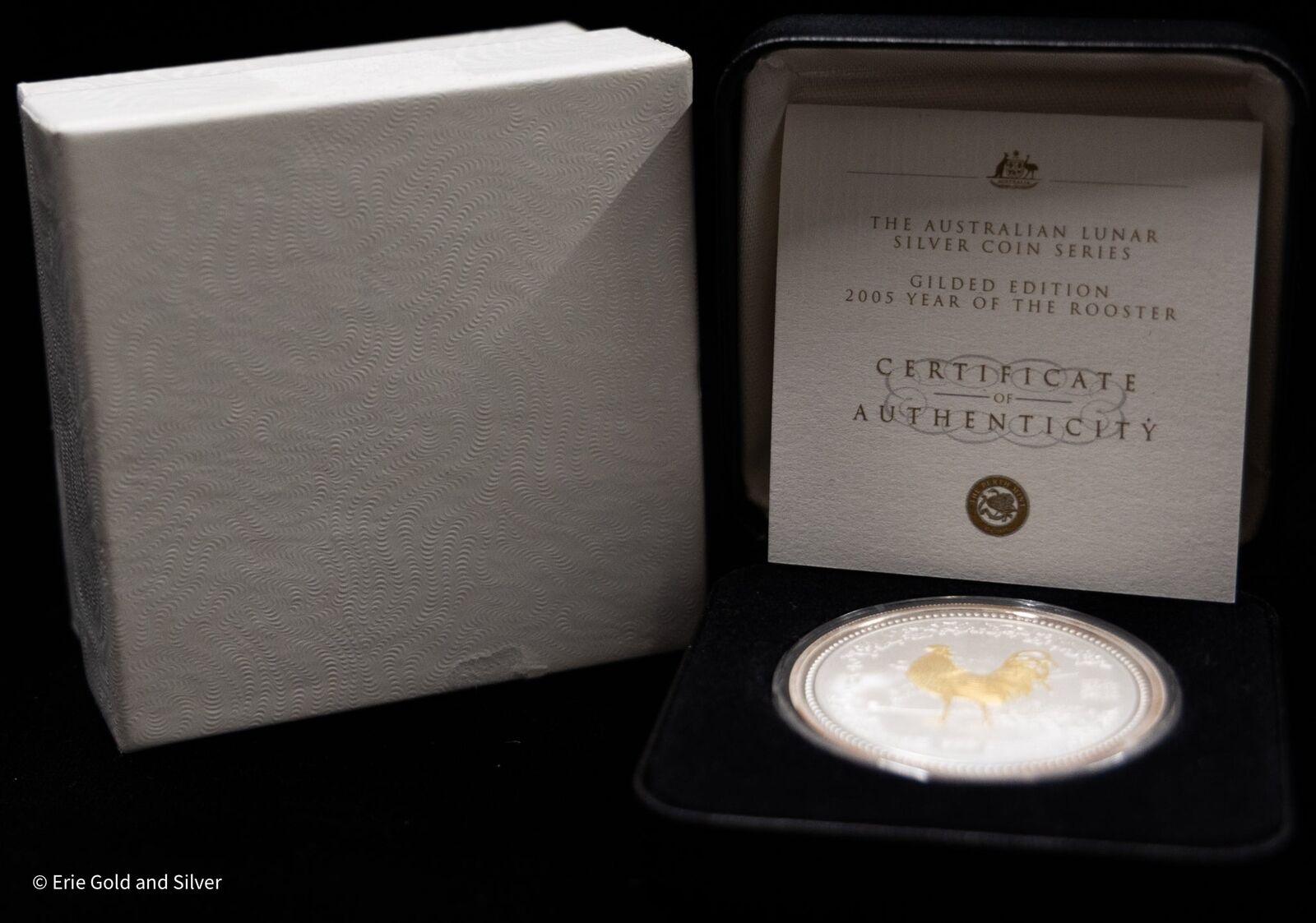 2005 Perth Mint Australian Lunar Series 1 oz Silver Rooster Gilded Edition