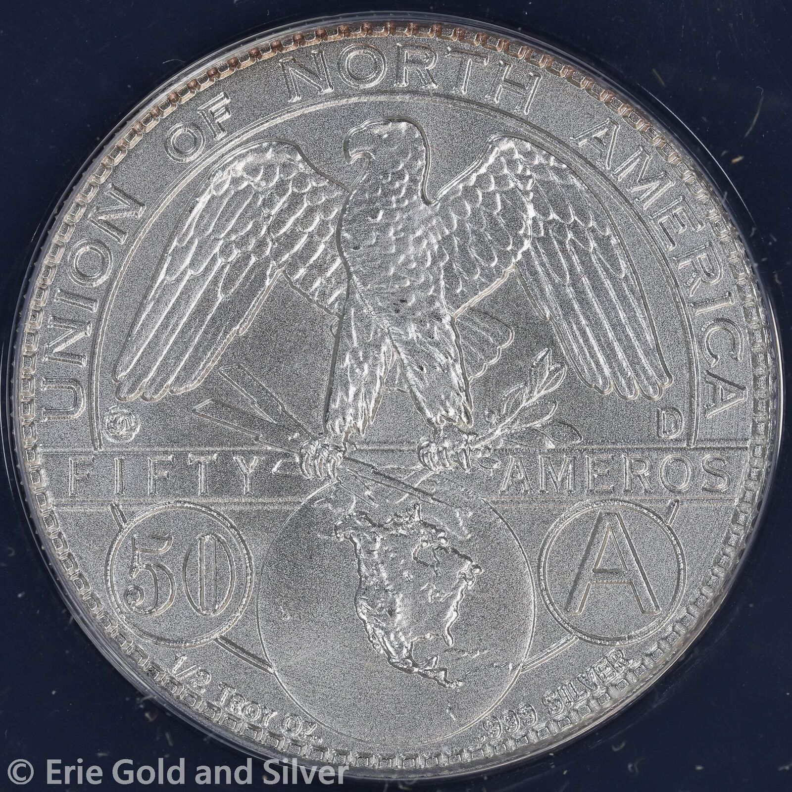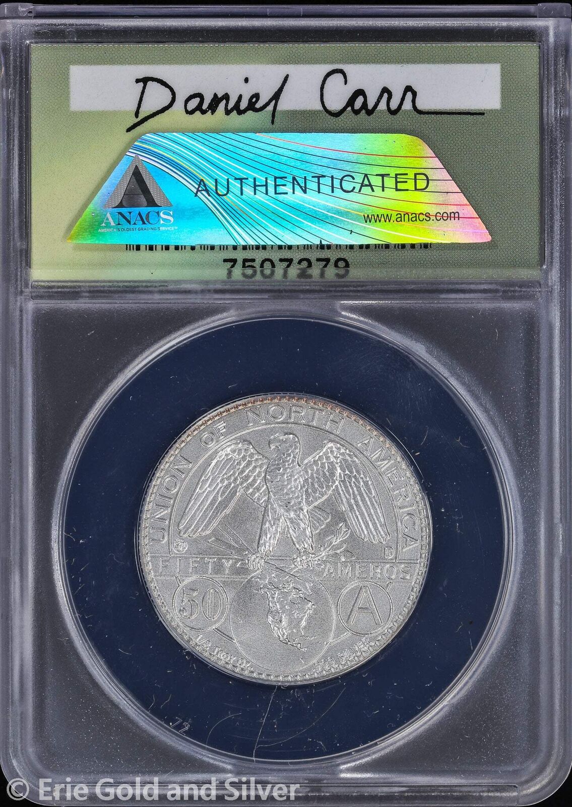 2007-D Dan Carr Silver 50 Ameros Seated Liberty Concept Token ANACS MS 70