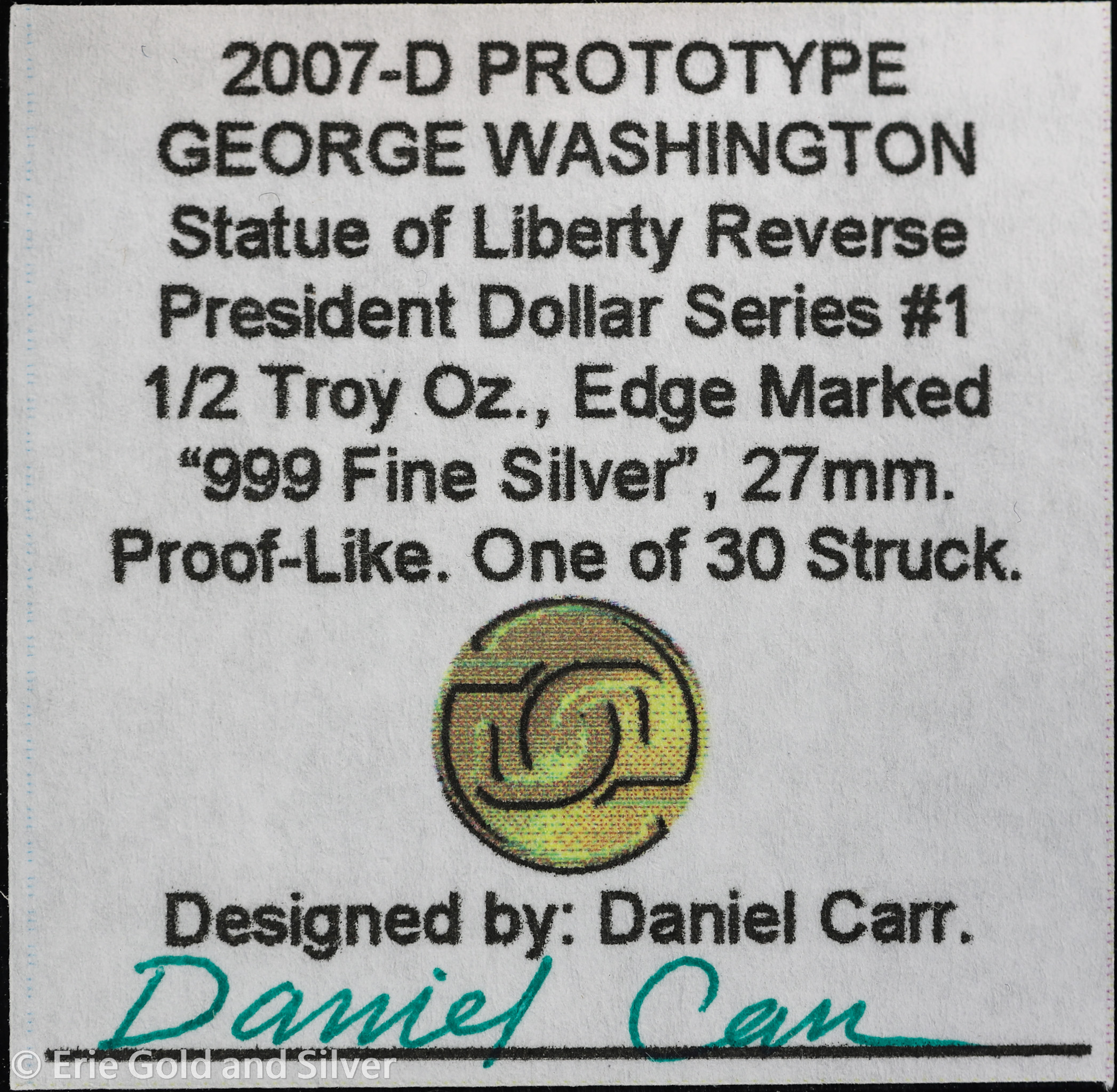 2007-D Daniel Carr Moonlight Mint George Washington Concept Dollar 1/2 oz Silver Proof-like Token with COA ANACS MS 69 DCAM | 1 of 30 Struck