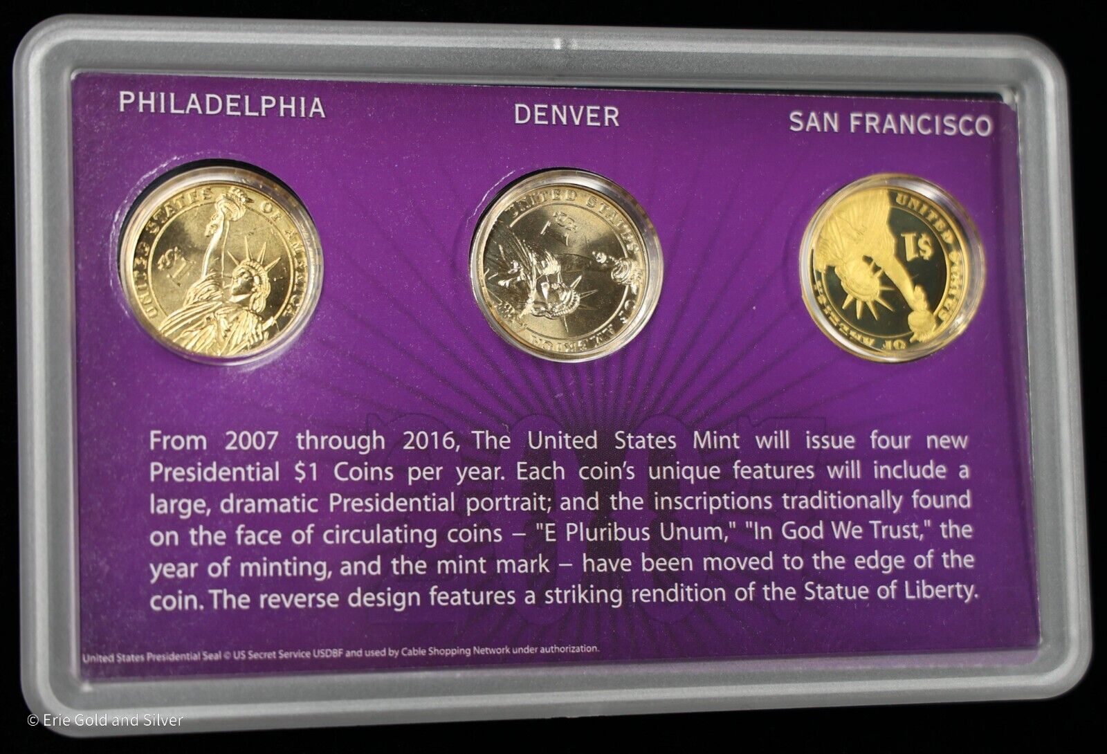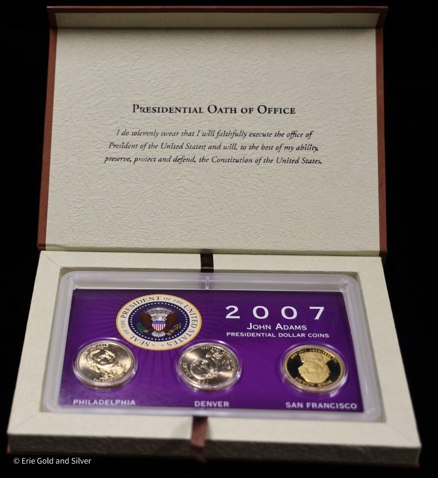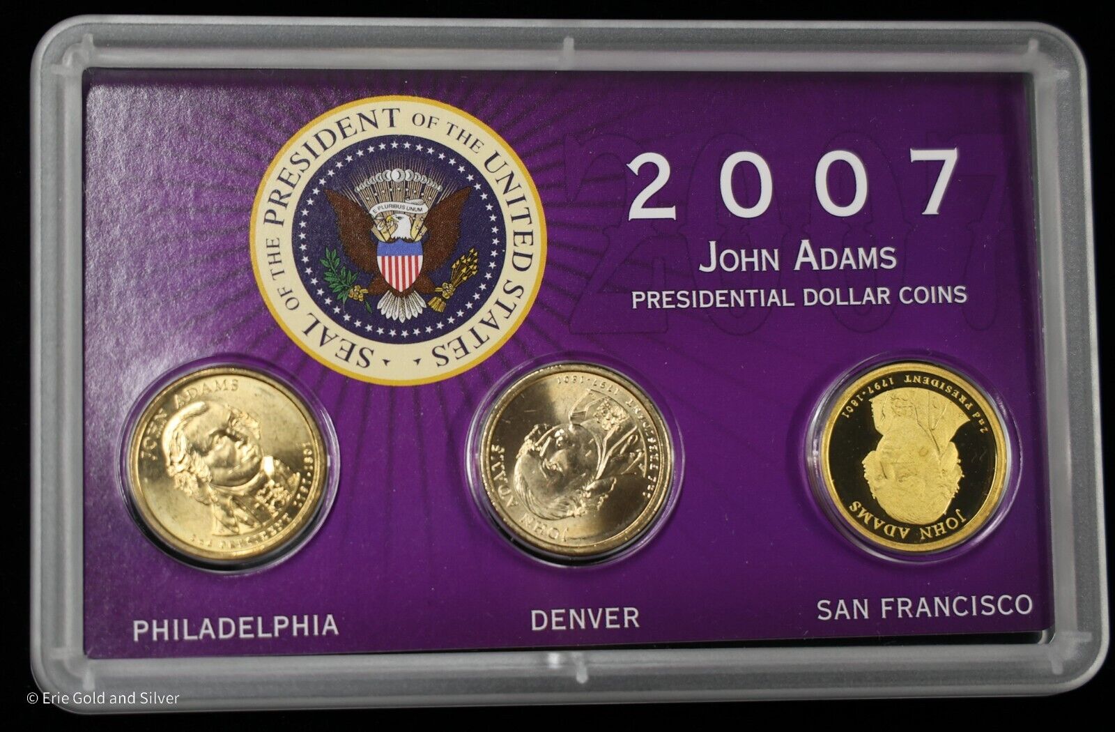 2007 PDS John Adams Presidential Dollar 3-Coin Set in Presentation Box