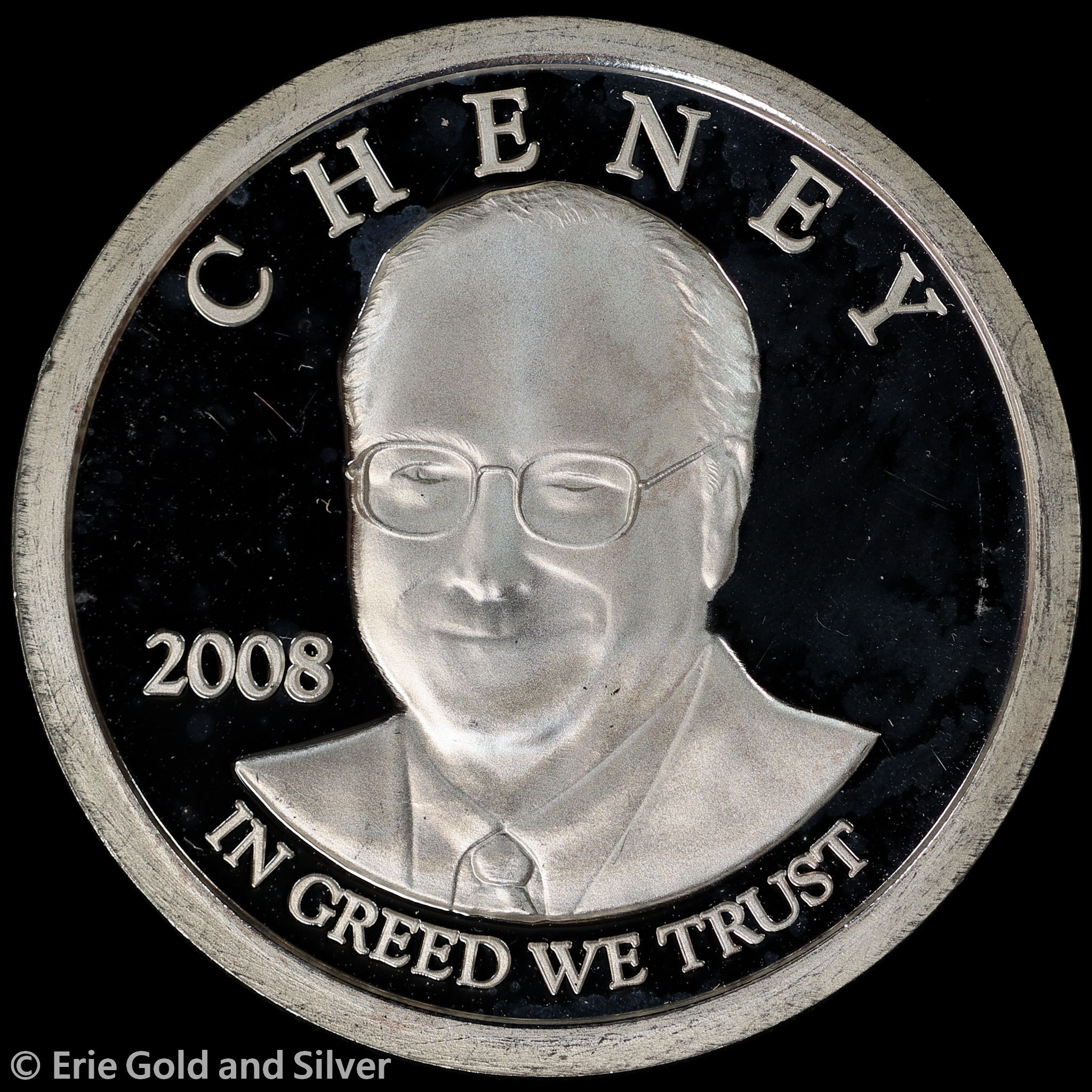 For sale is a 2008 Dick Cheney “In Greed We Trust” 1 oz .999 Silver Proof Round AOCS Approved.