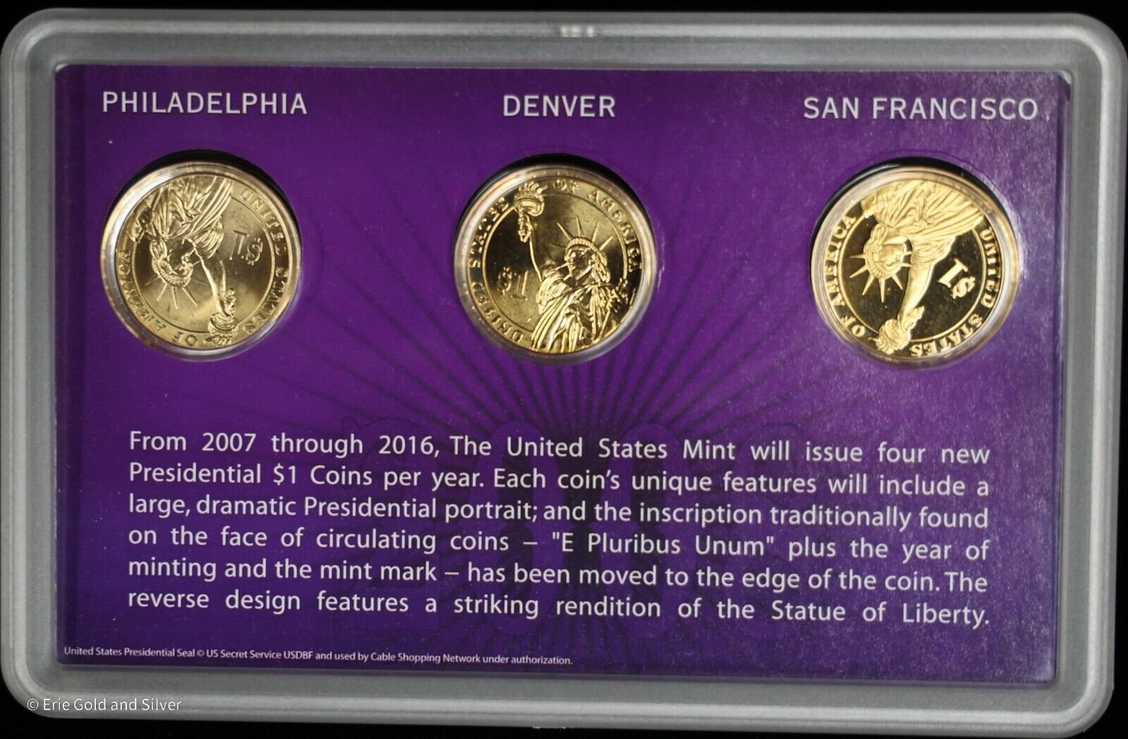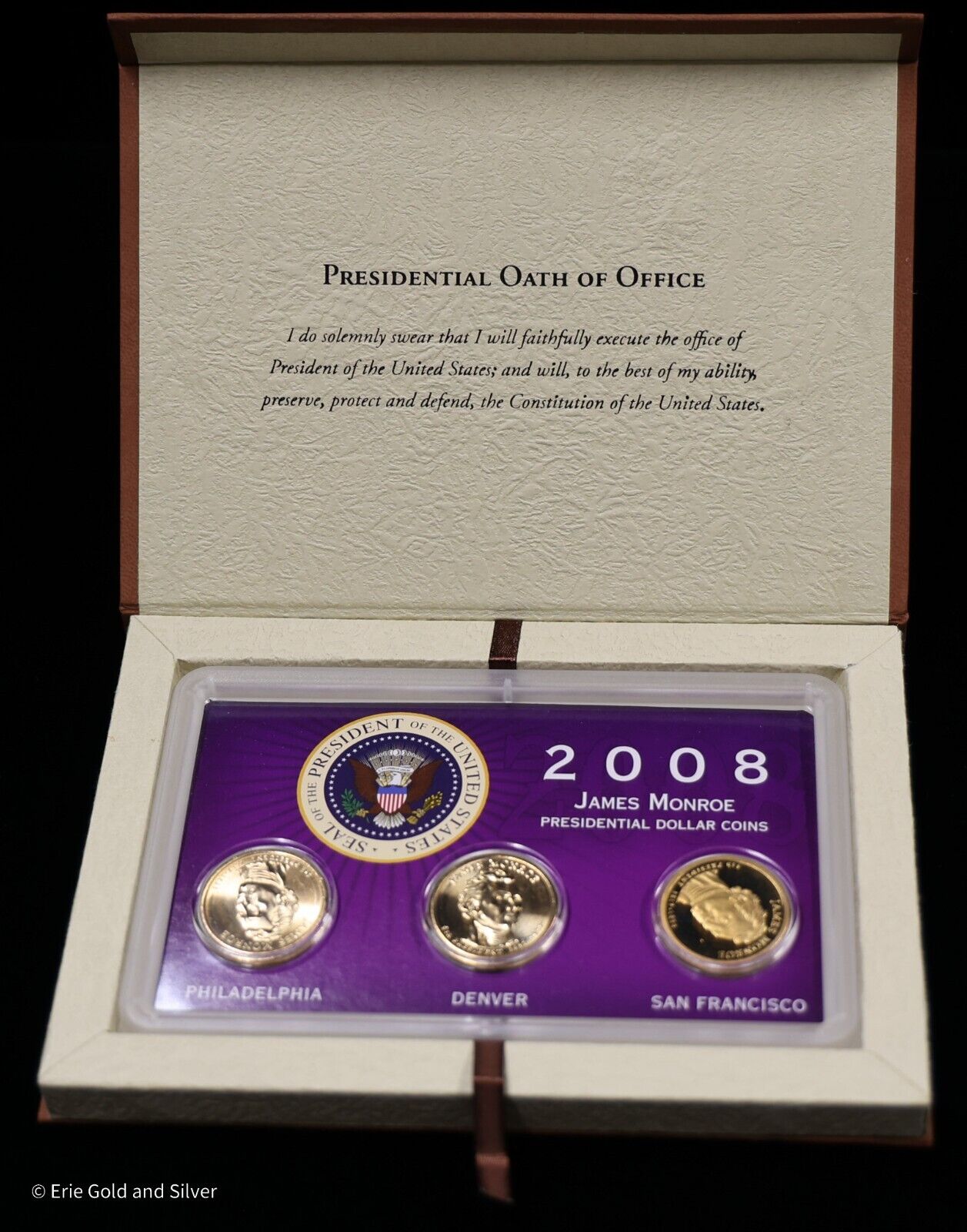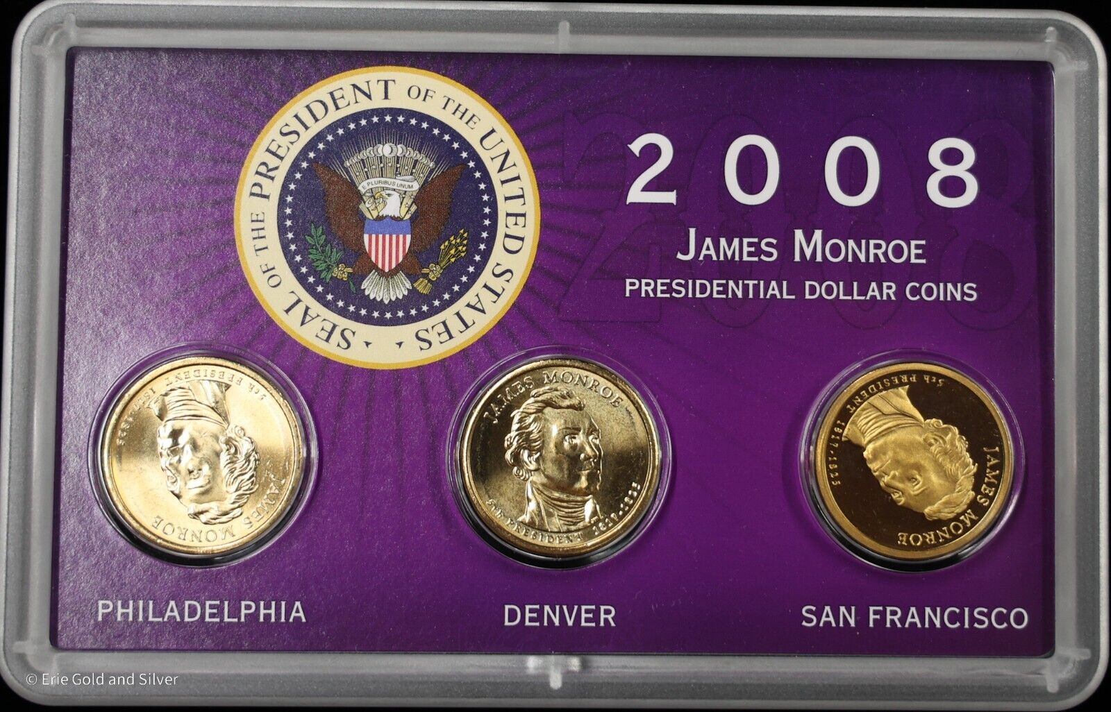 2008 PDS James Monroe Presidential Dollar 3-Coin Set in Presentation Box