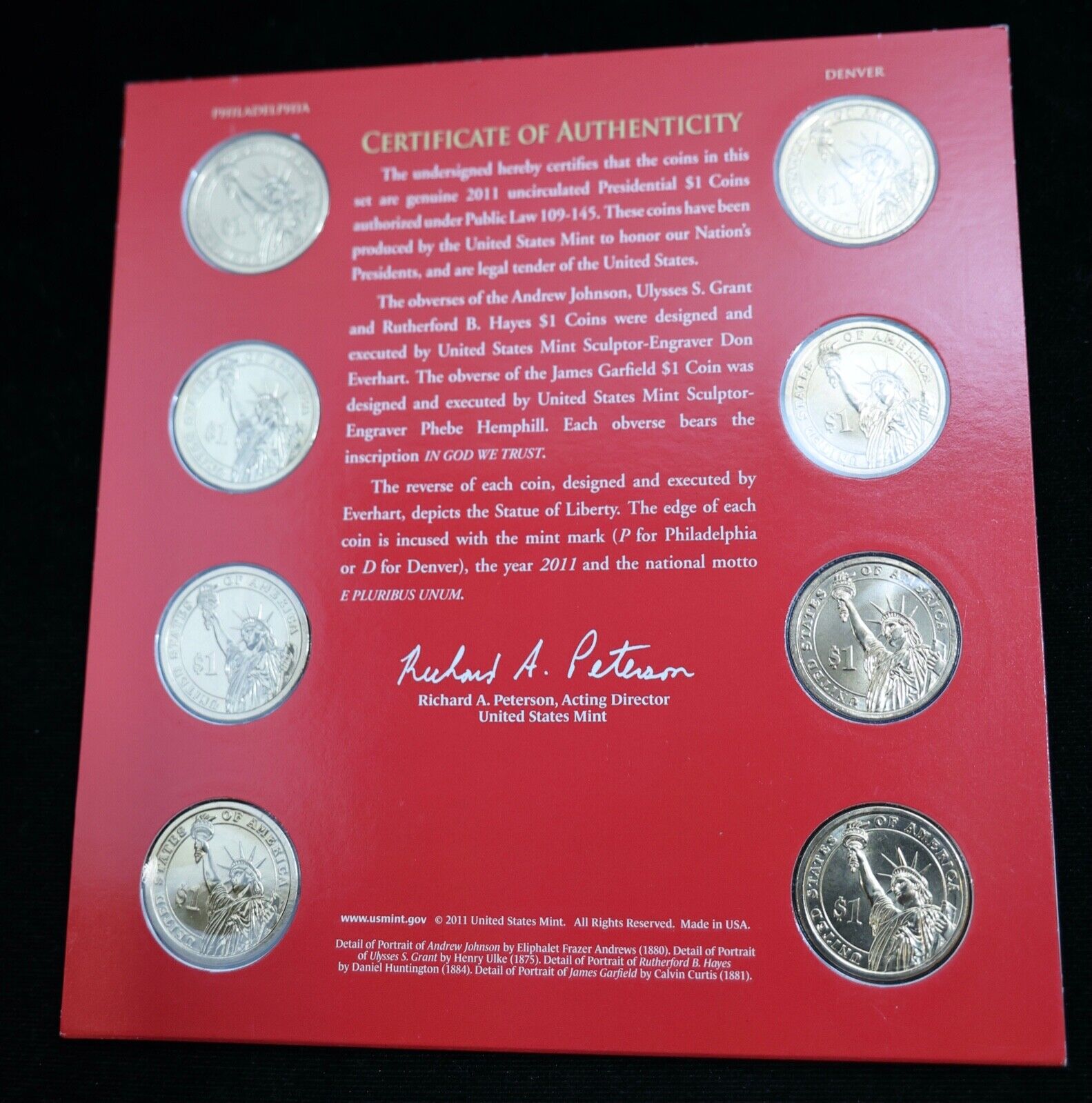 2011 U.S. Mint P&D Presidential Dollar 8-Coin Mint Set with COA