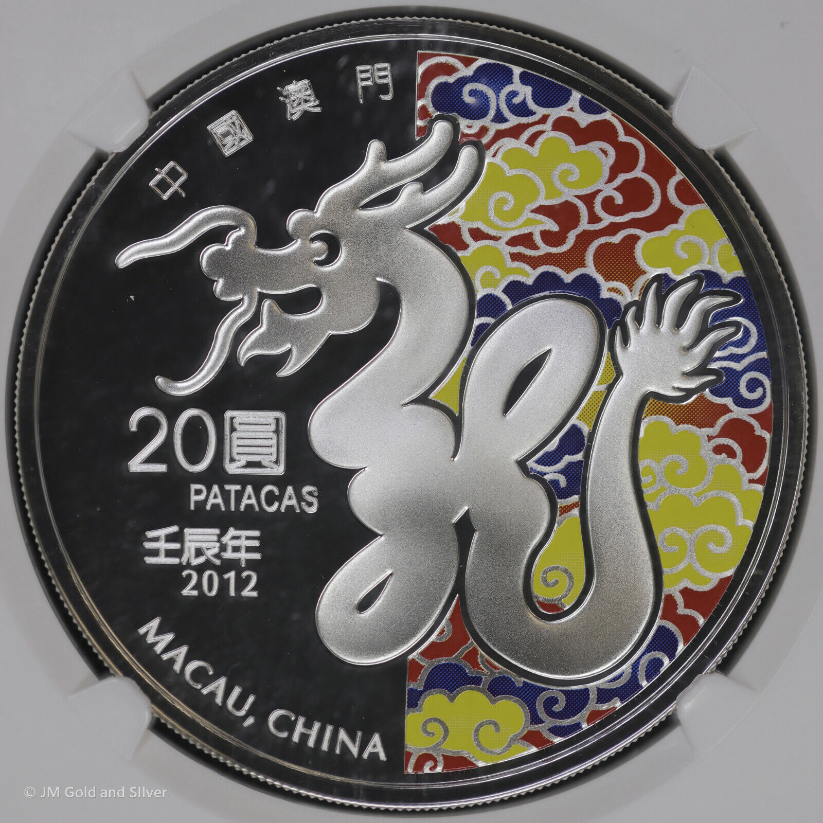 2012 1 oz Silver Macao 20p Colorized Year of the Dragon NGC PF 70 Ultra Cameo