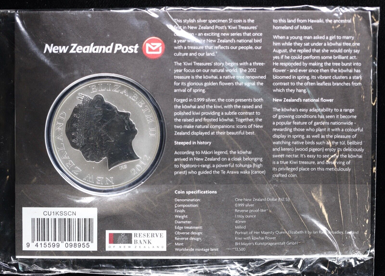 2012 New Zealand Kiwi Treasures 1 oz Silver Specimen Coin Reverse Proof- Like