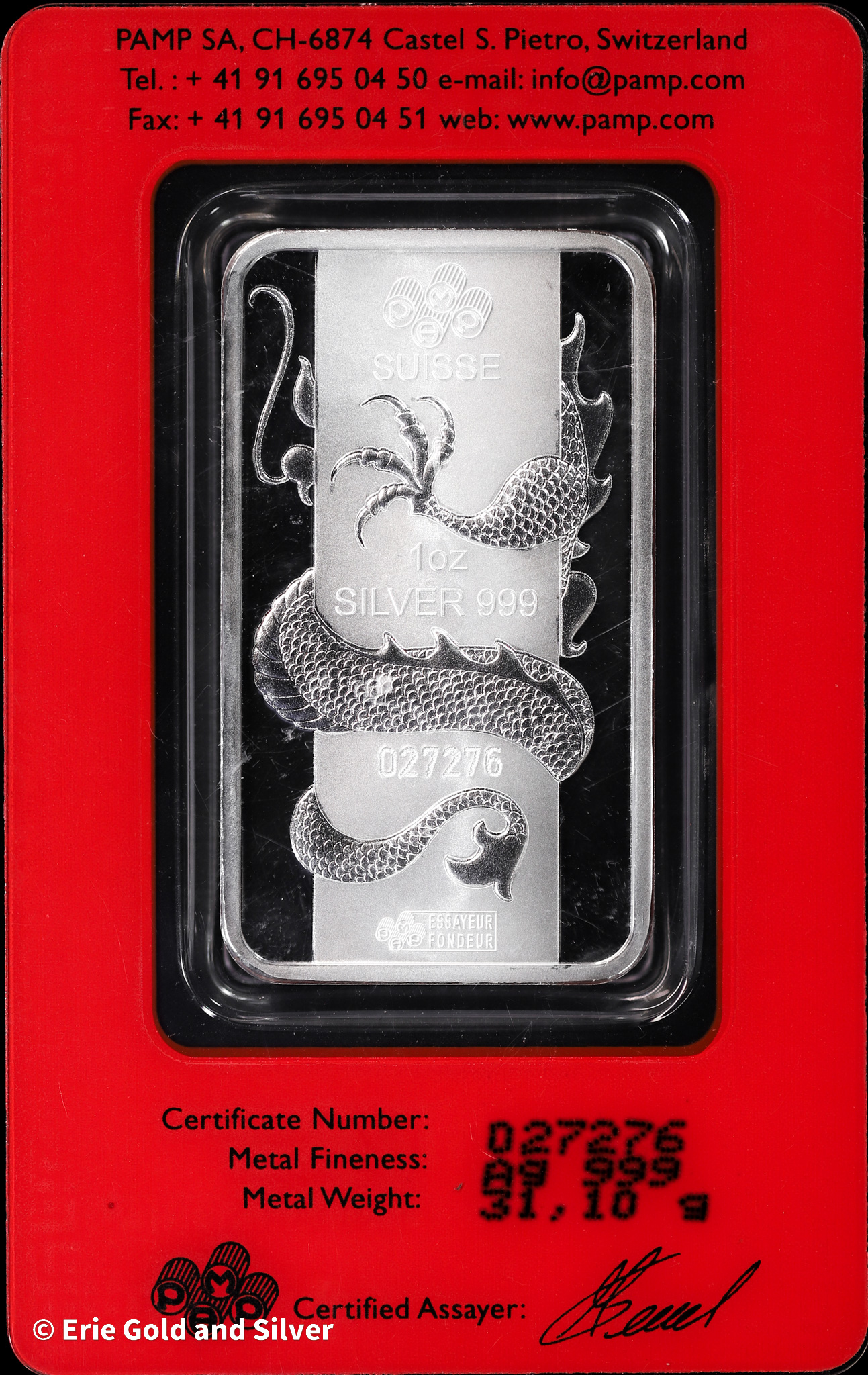 2012 PAMP Lunar Calendar Dragon 1 oz Silver Bar in Assay