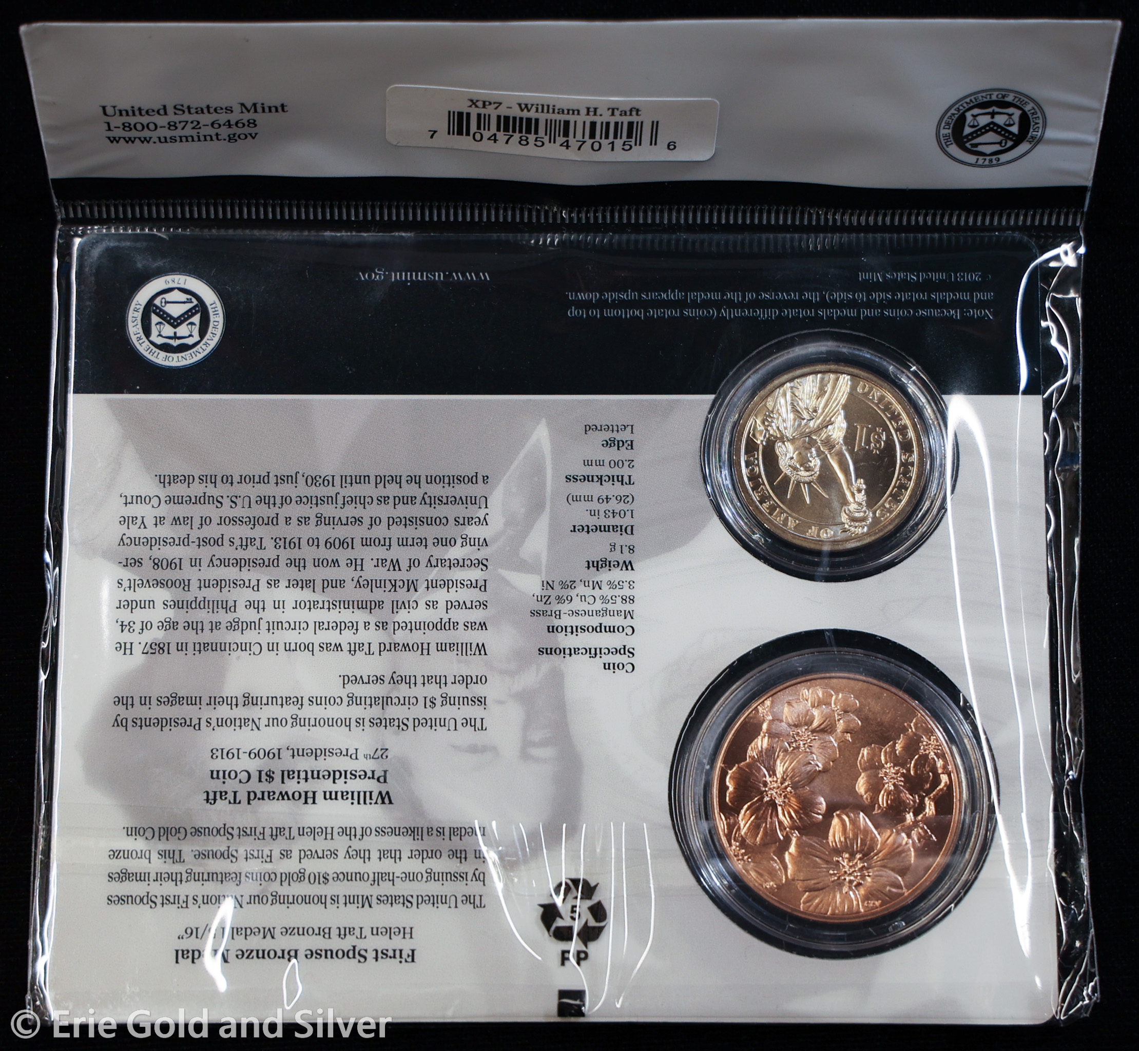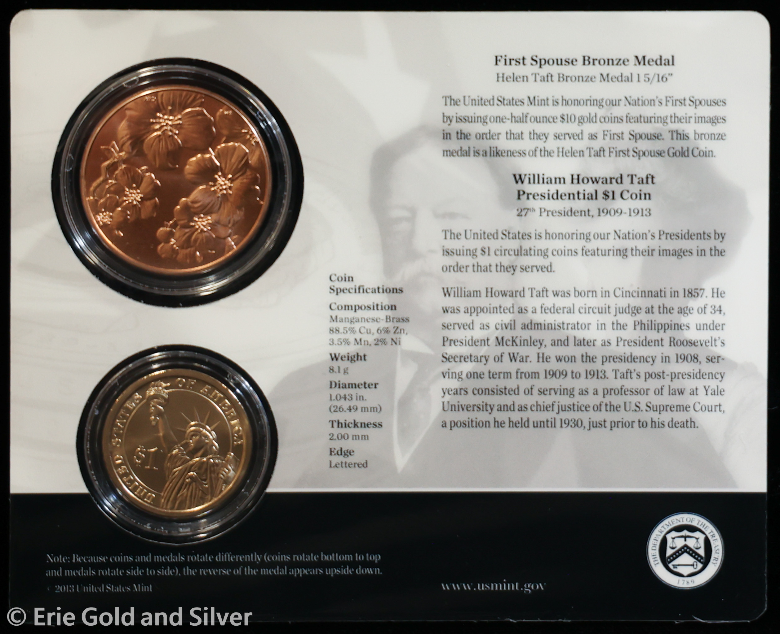 For sale is a 2013 Presidential Dollar Coin & First Spouse Medal Set #27 - William Howard Taft.