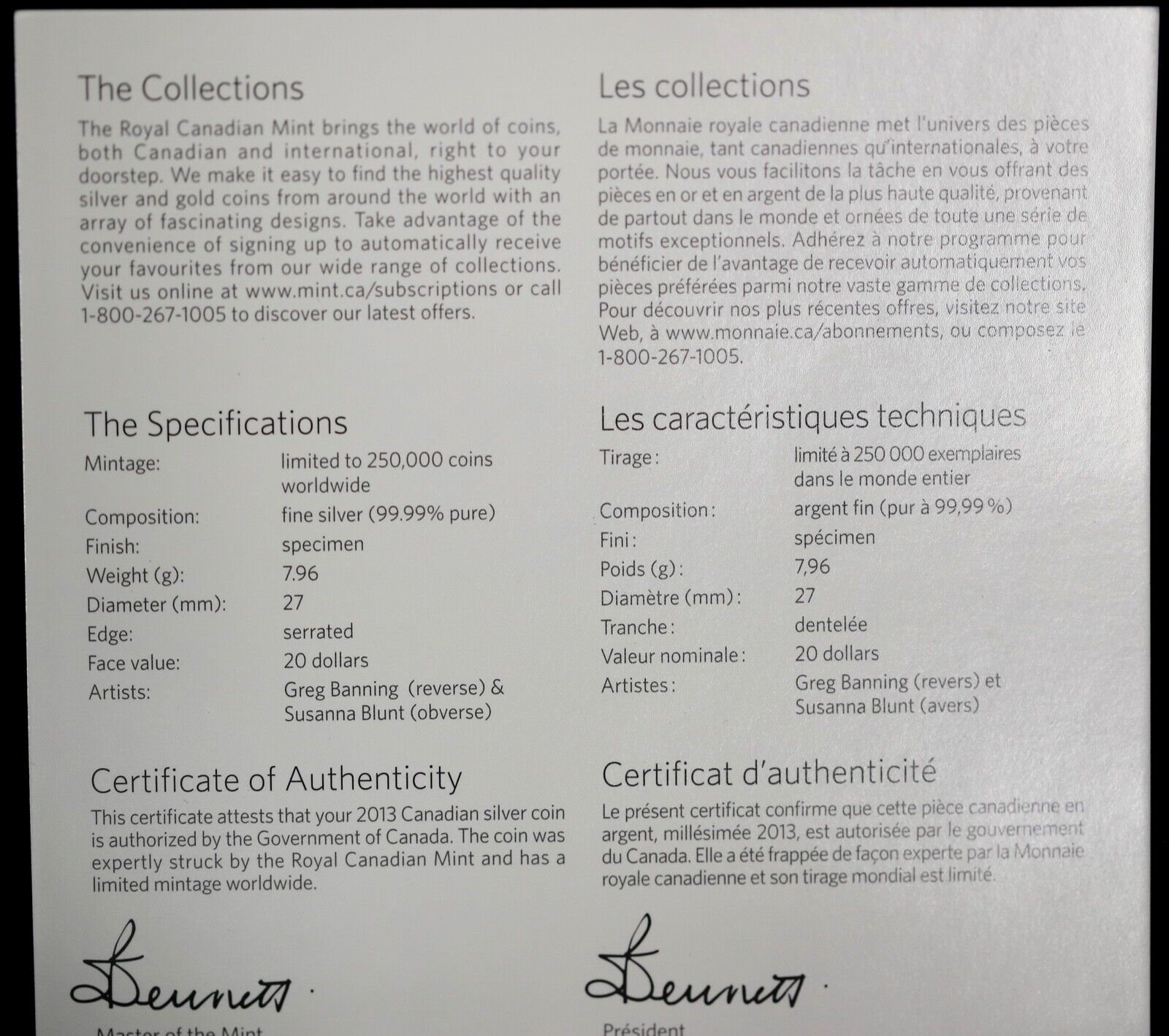 2013 Royal Canadian Mint $20 .9999 Fine Silver Hockey