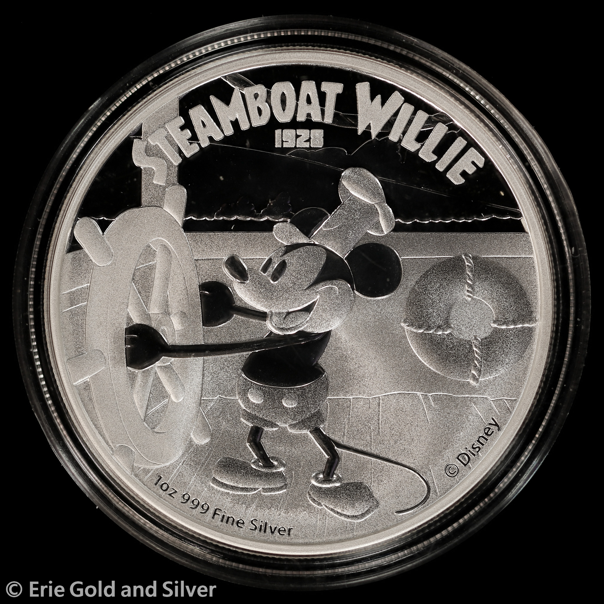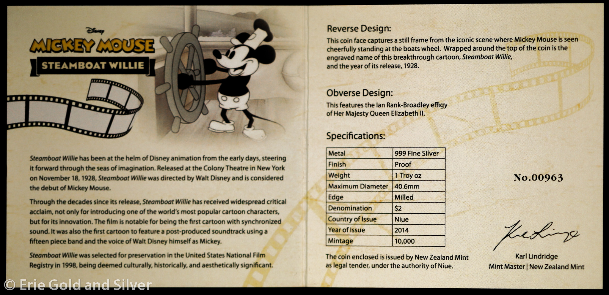 For sale is a 2014 $2 Niue Disney Mickey Mouse Steamboat Willie 1 oz Silver Proof Coin in OGP.