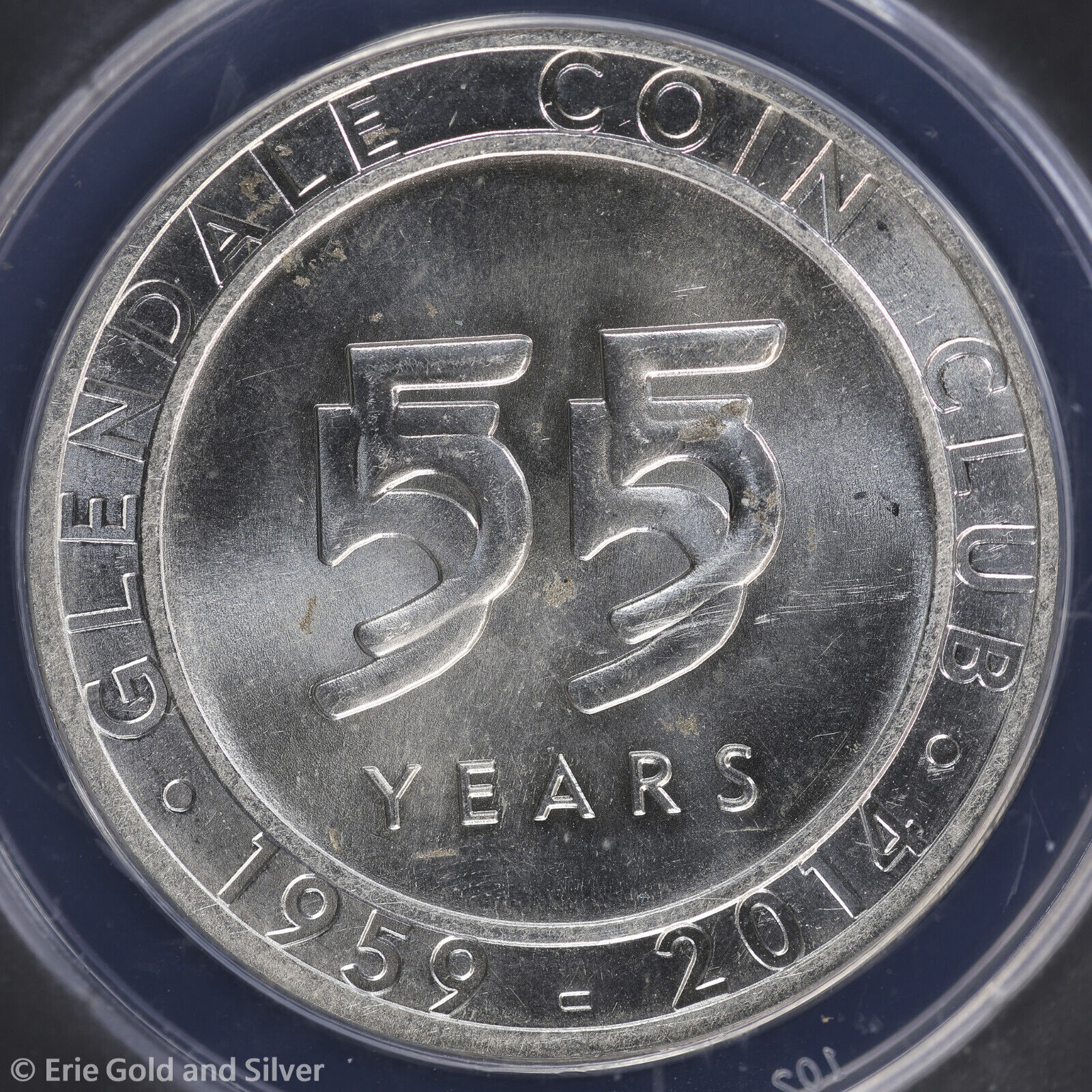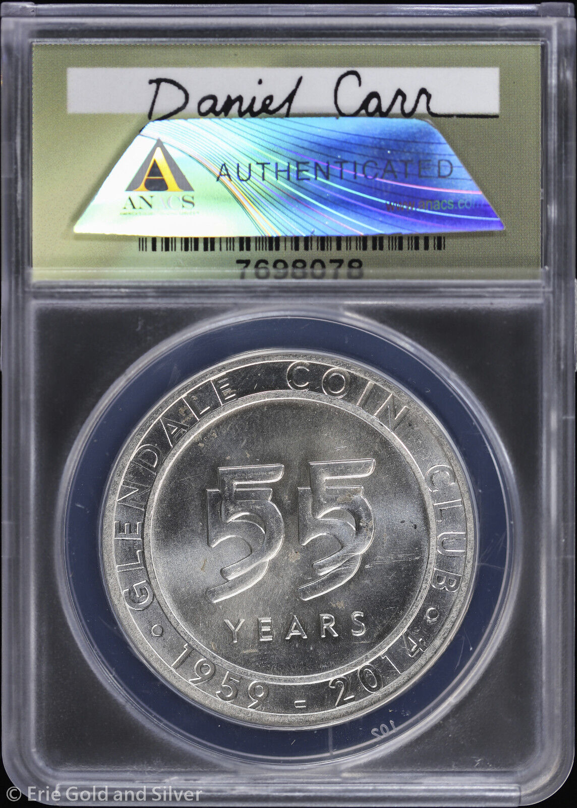2014 Dan Carr Glendale Coin Club 55th Anniv Silver Medal ANACS MS 65