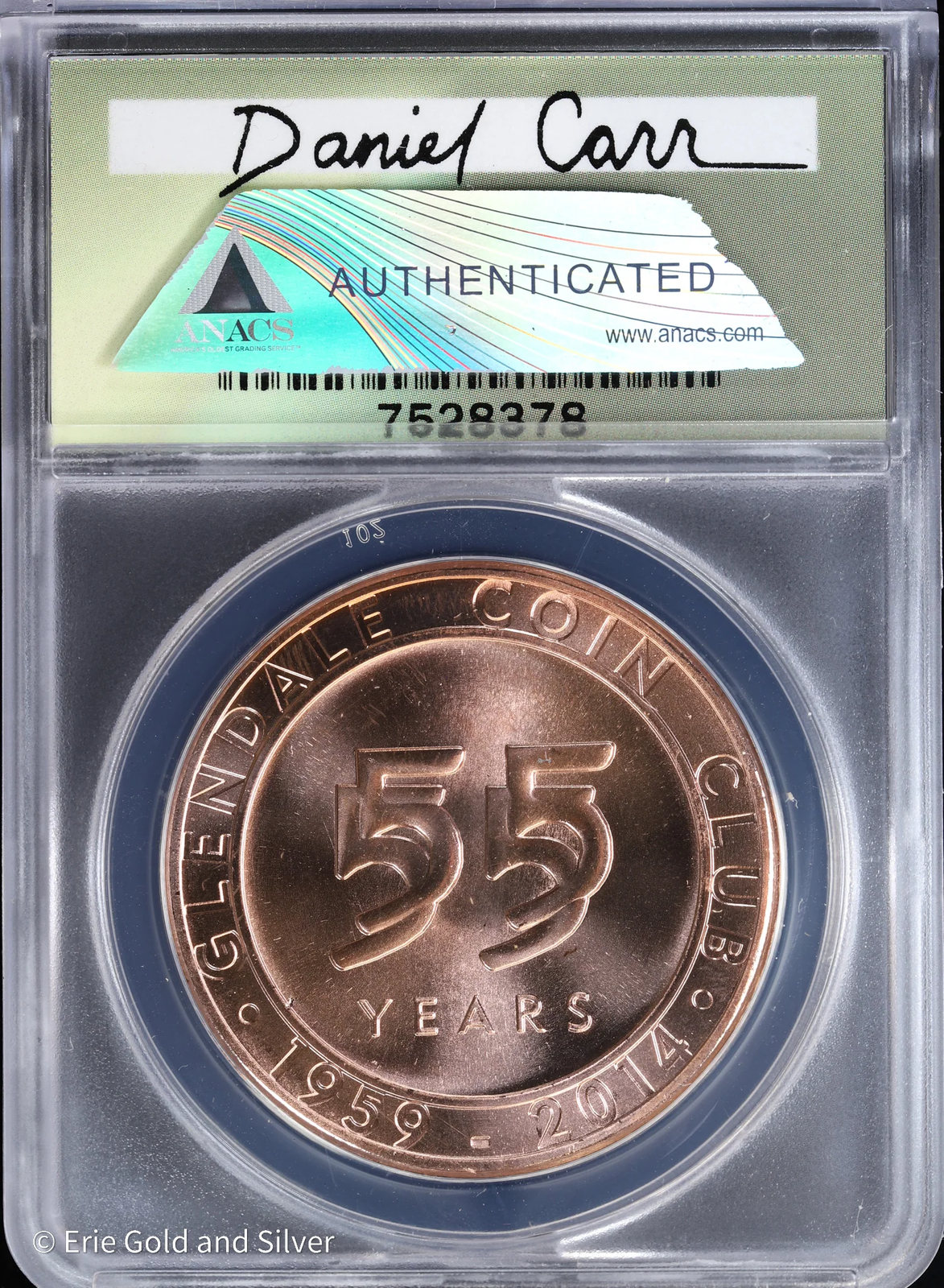 2014 Dan Carr Glendale Coin Club 55th Anniversary Copper Medal ANACS MS 69 Red