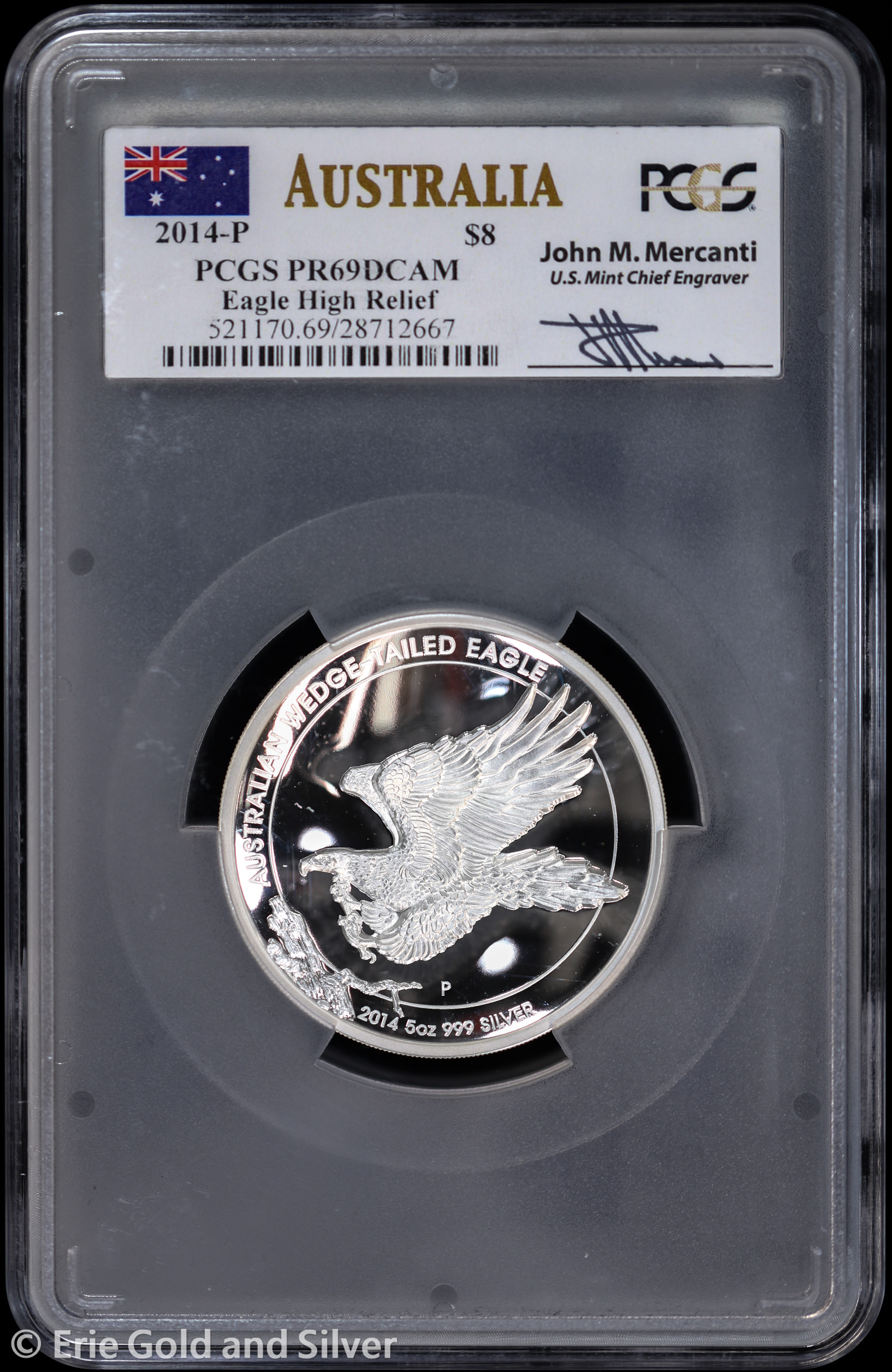 2014-P $8 Australia Wedge-Tailed Eagle 5 oz Silver Proof High Relief Coin with Box & COA PCGS PR 69 DCAM | John M. Mercanti Signed Slab