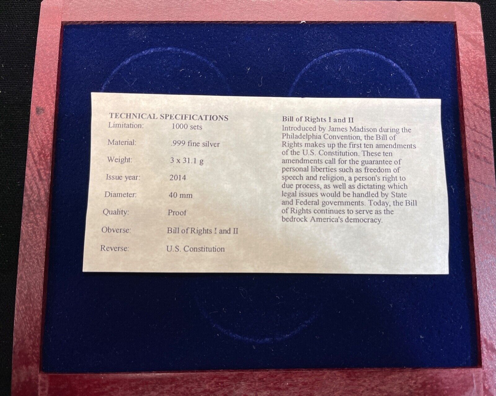 2014 U.S. Constitution 1791 Bill of Rights I and II Proof Silver