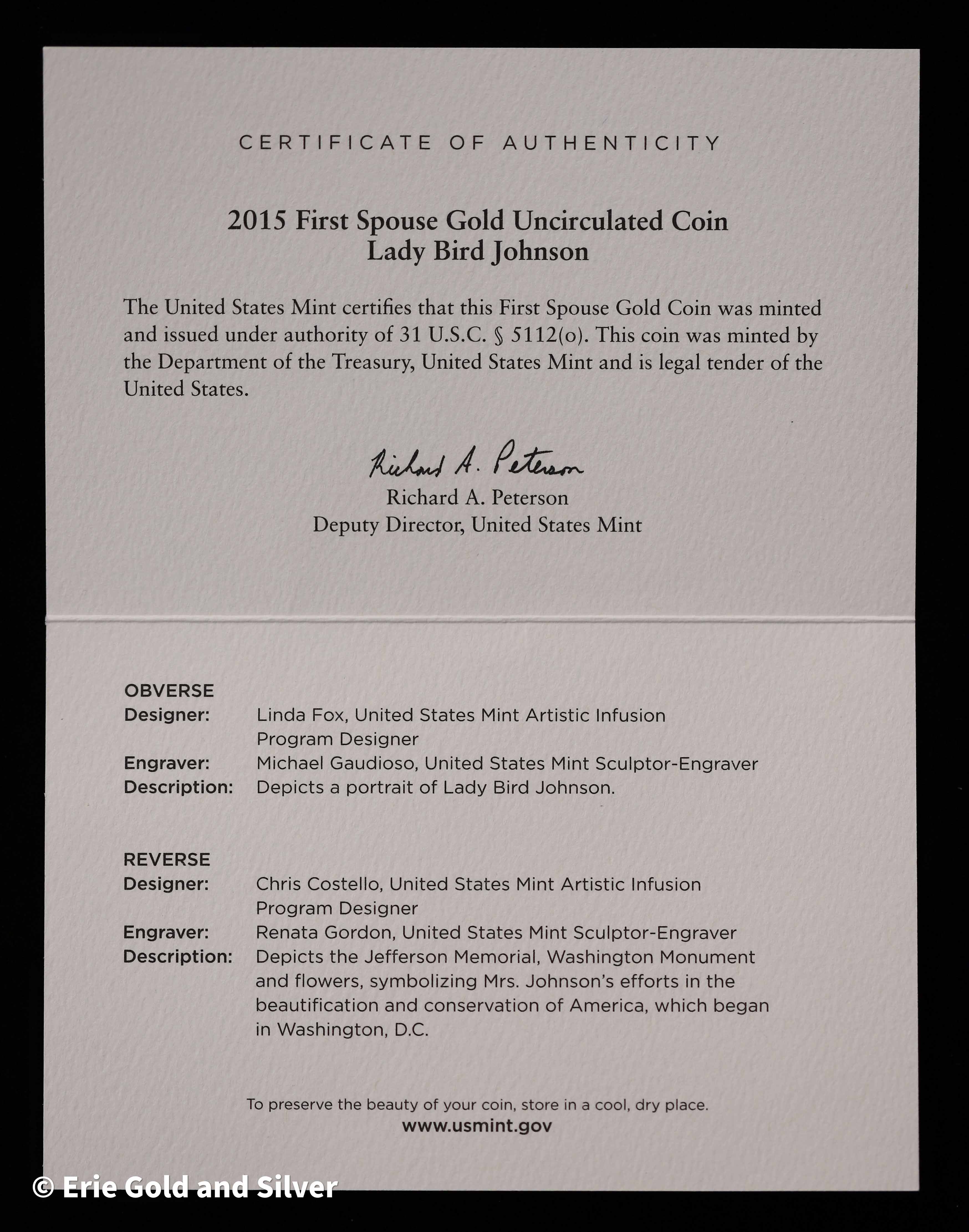 2015-W $10 First Spouse Lady Bird Johnson 1/2 oz Gold Coin in OGP