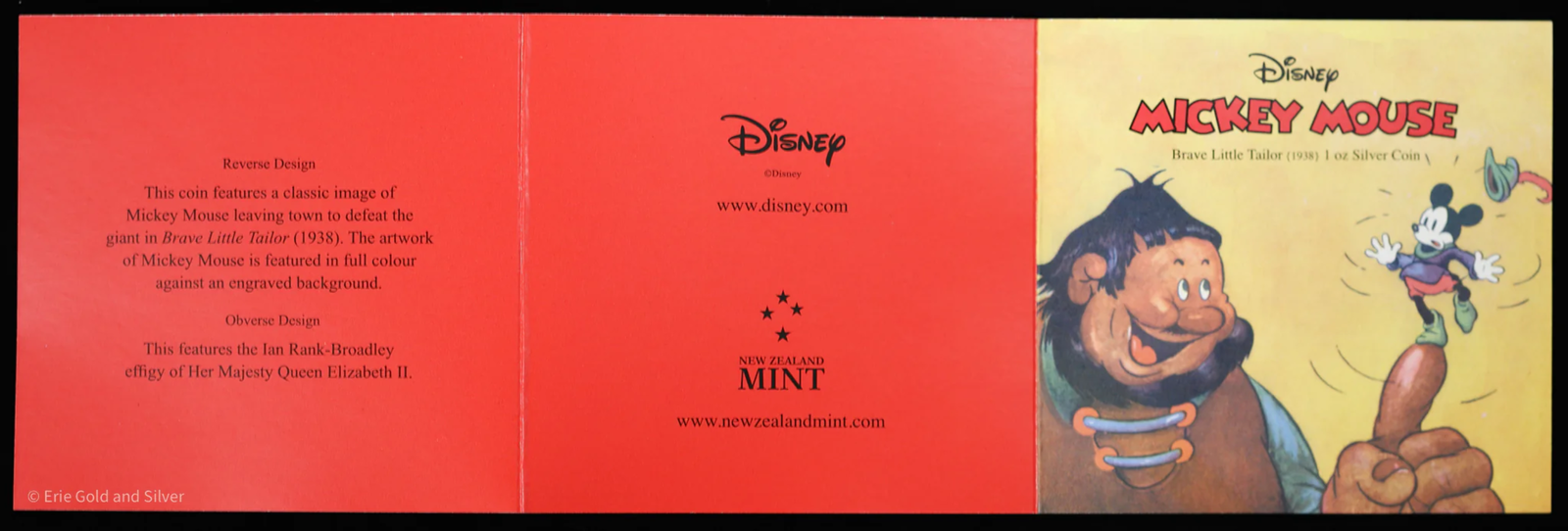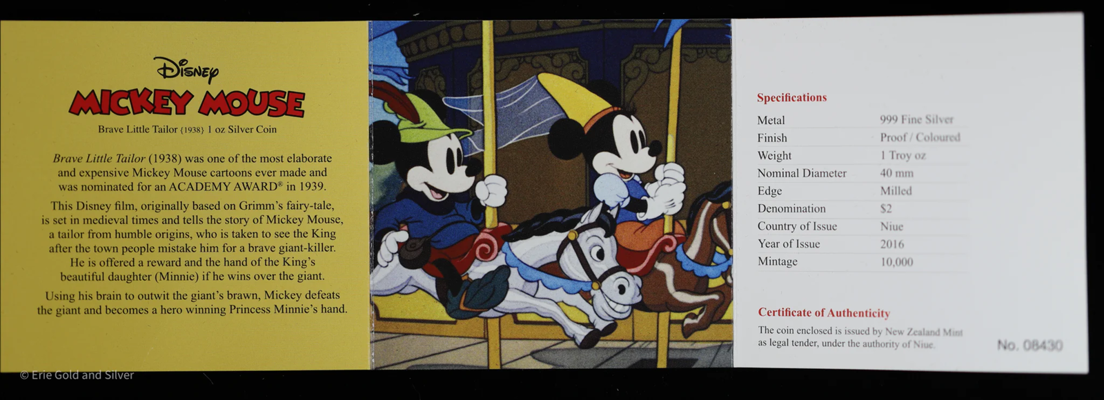 For sale is a 2016 Mickey Mouse Brave Little Tailor 1 oz .999 Silver Proof Coin in OGP. View pictures for details and condition. View pictures for details and condition, the coin pictured is the exact coin you will receive. Feel free to contact us with any questions.