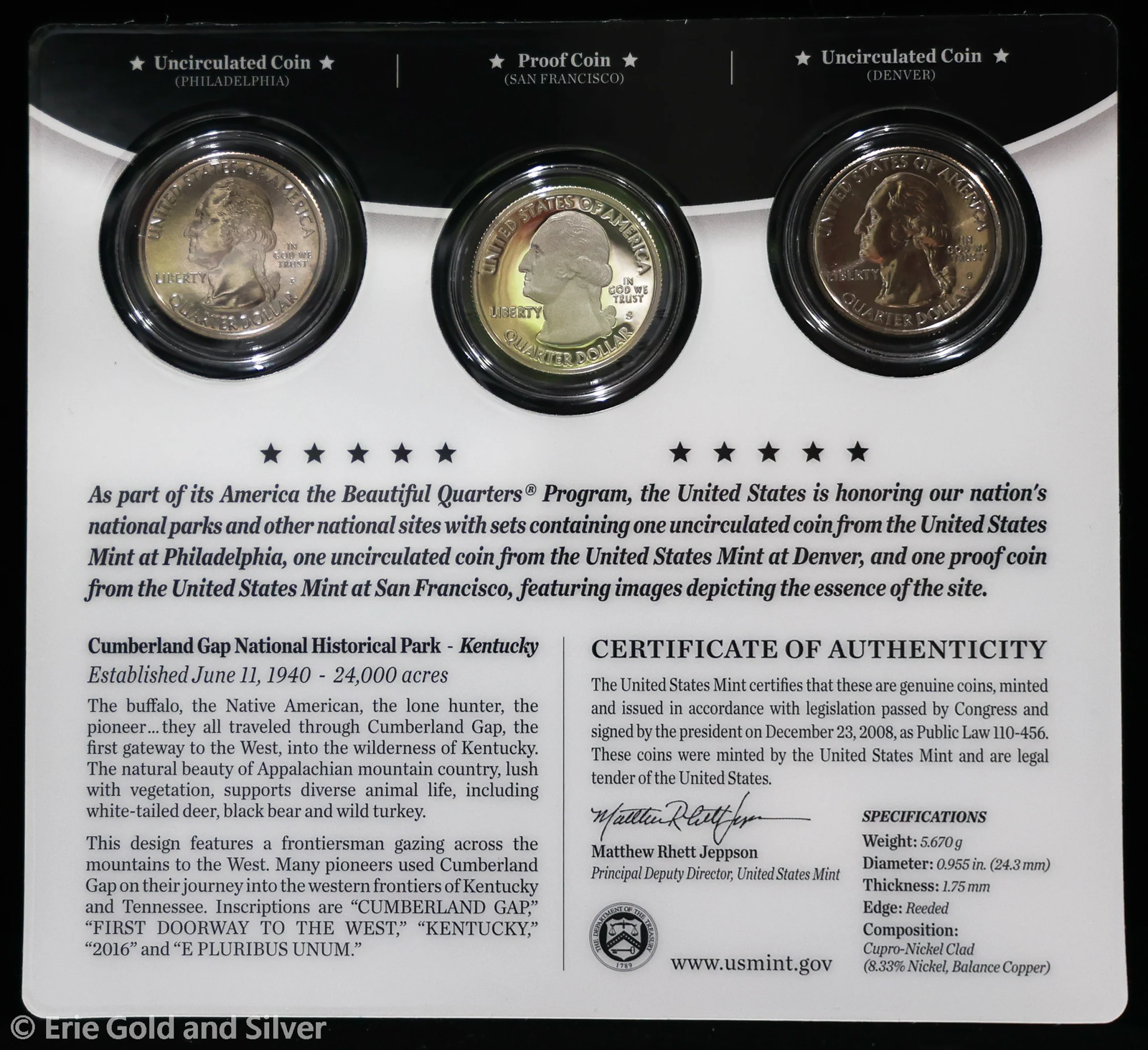 2016 P D S 25c ATB Cumberland Gap Nat'l Historical Park Quarters 3 Coin Set | BU
