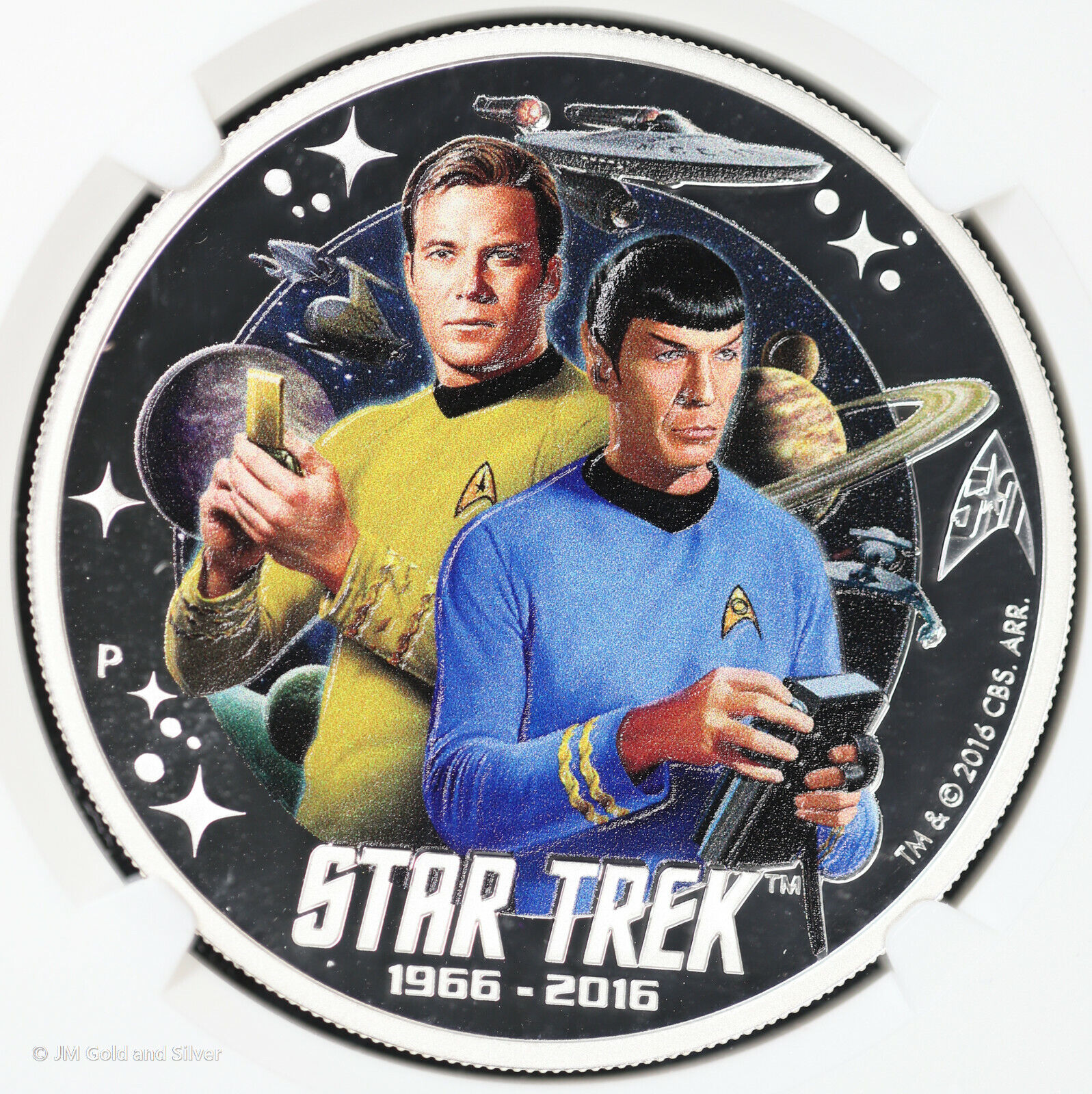 2016 $1 Tuvalu 1 oz Silver Star Trek James T Kirk & Spock NGC PF 70 UC Colorized ER
