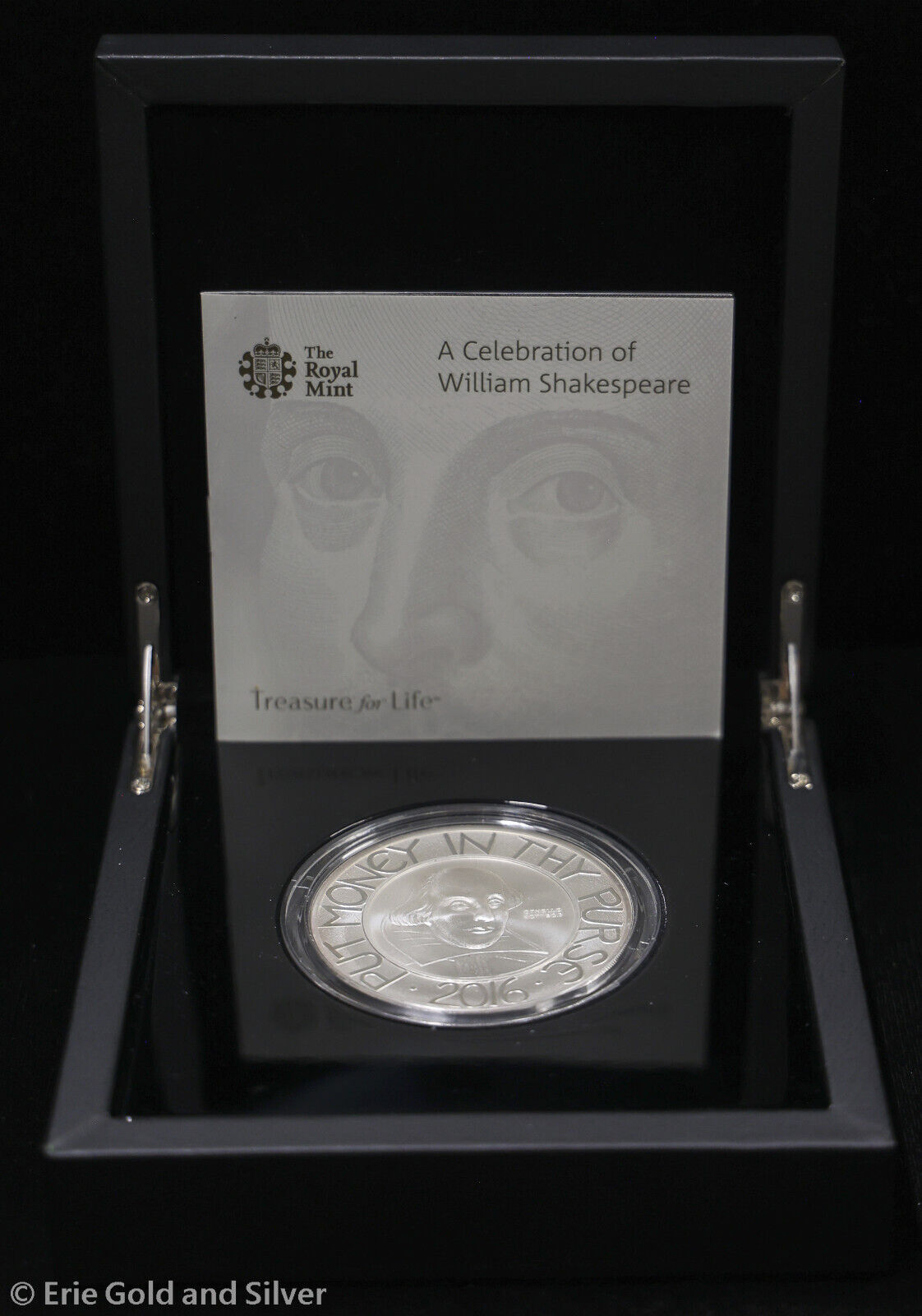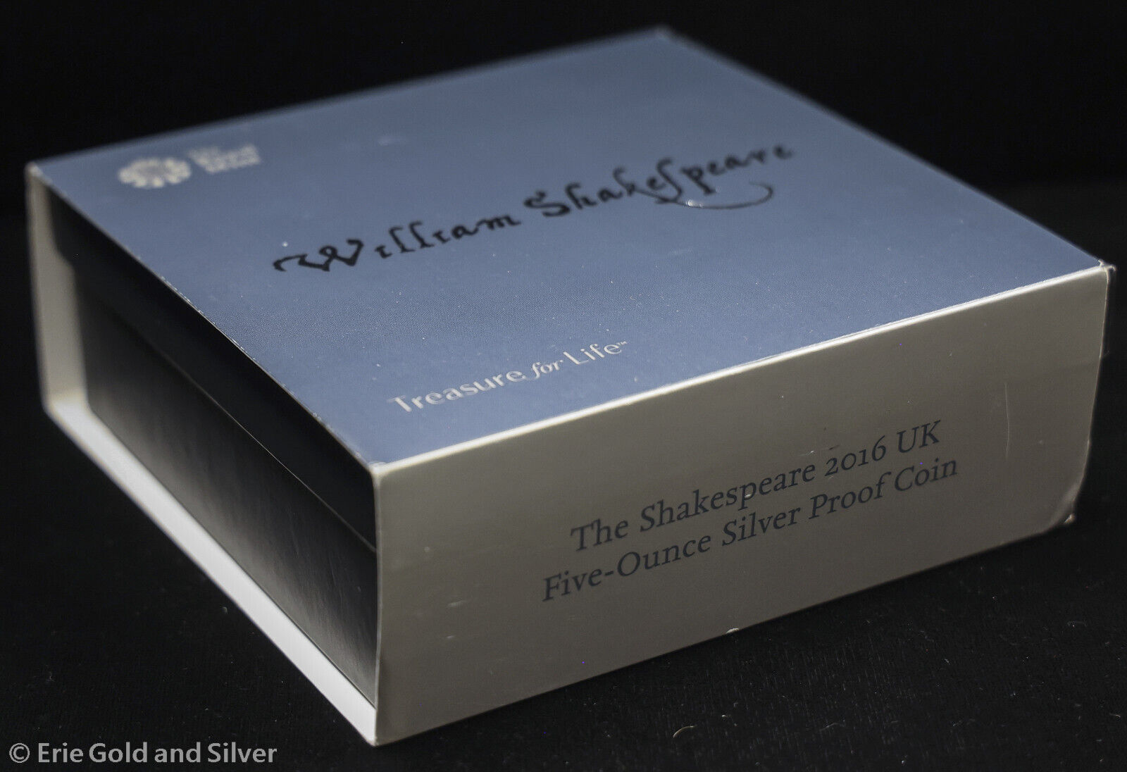 For sale is a 2016 UK Royal Mint Treasure for Life 5 oz Silver Proof William Shakespeare Coin. View pictures for details and condition, the coin pictured is the exact coin you will receive. Feel free to contact us with any questions.
