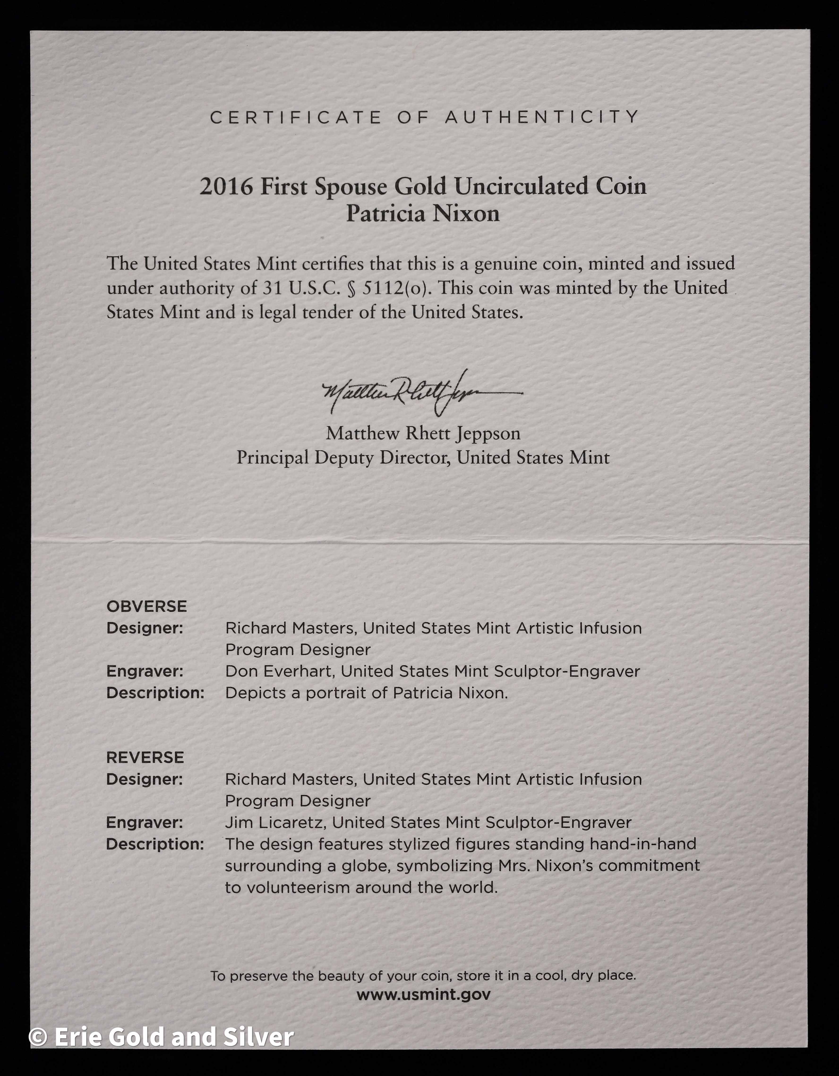 2016-W $10 First Spouse Patricia Nixon 1/2 oz Gold Coin in OGP