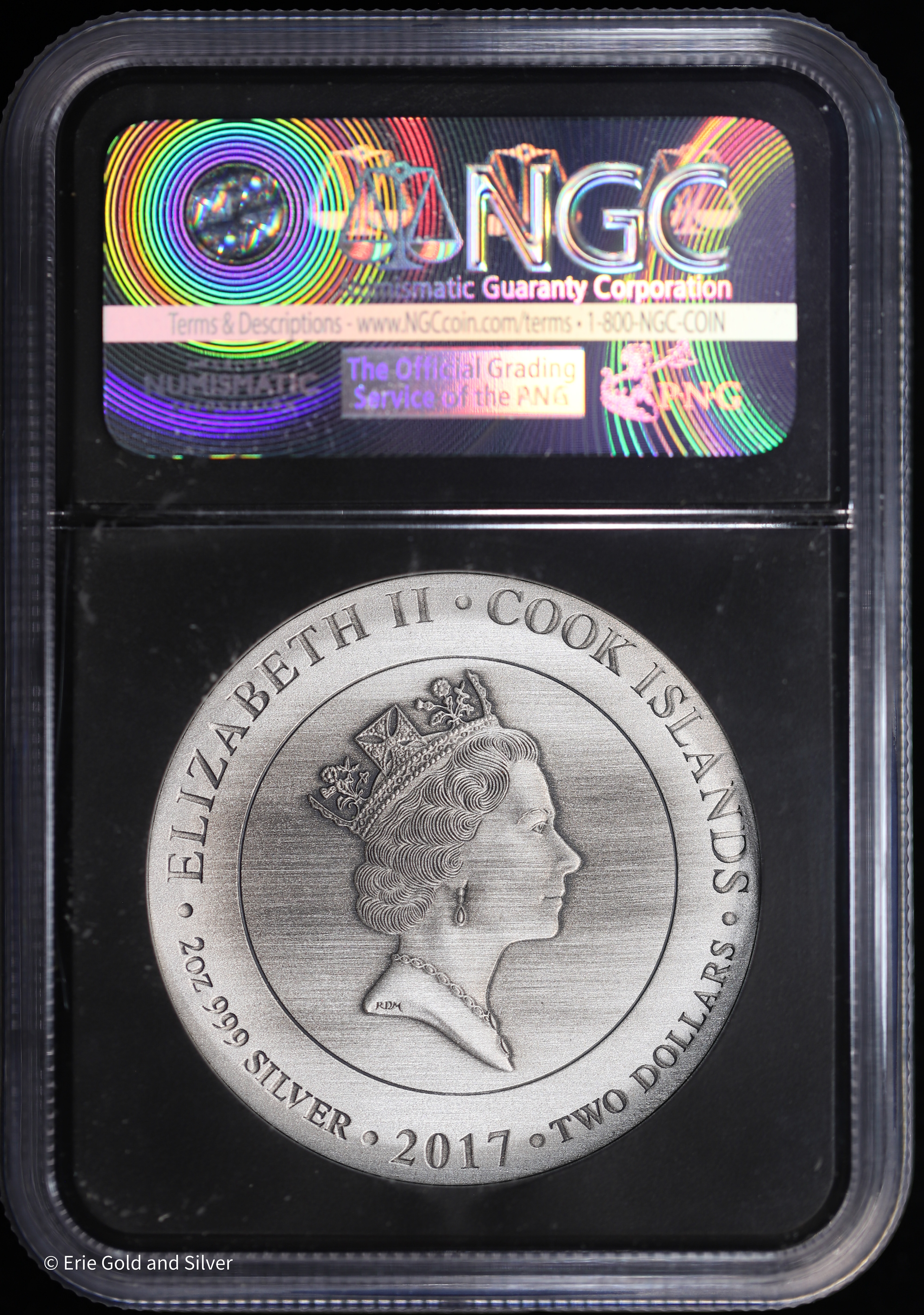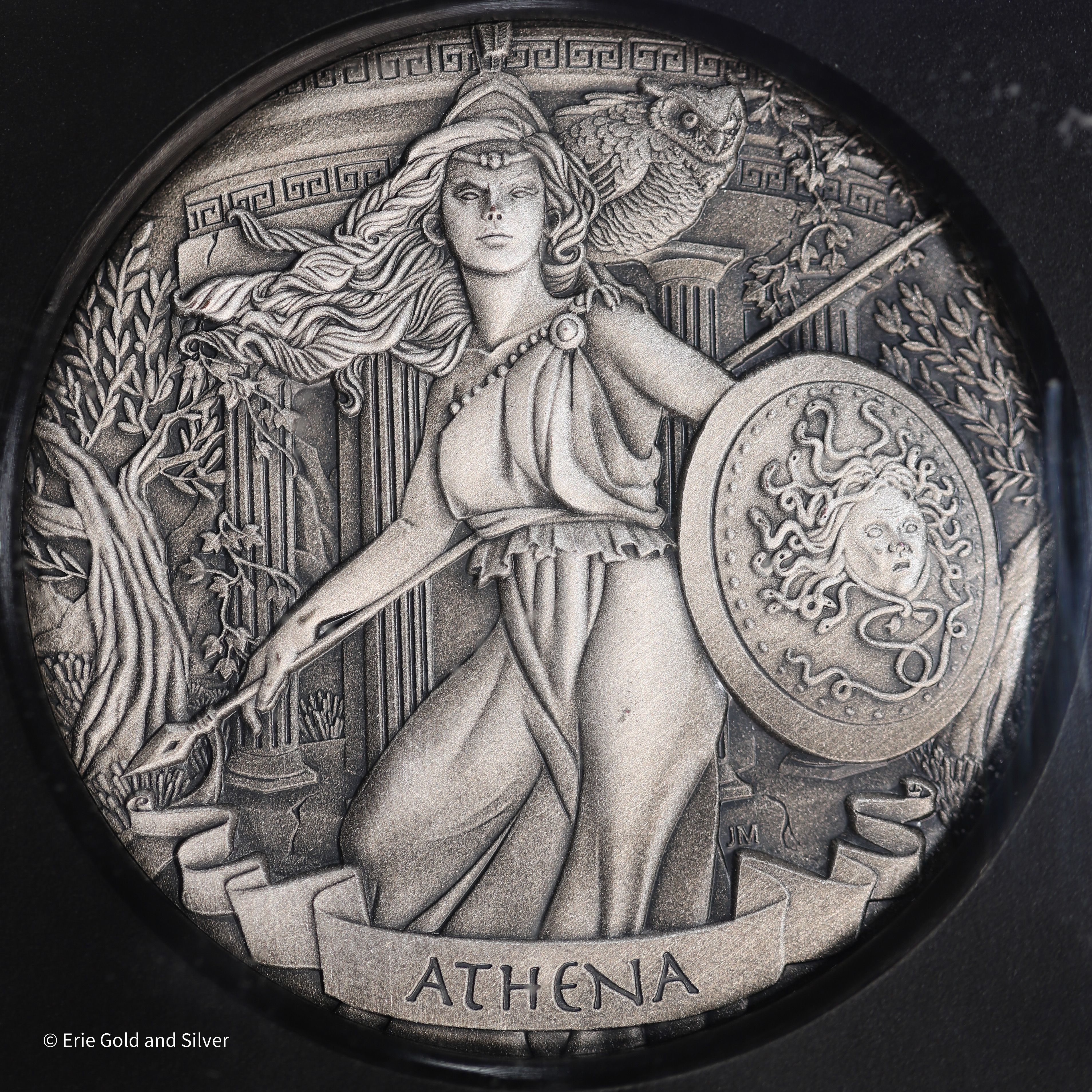 For sale is a 2017 $2 Athena Gods of Olympus 2 oz Silver - Gods and Goddesses Series from Cook Islands .999 silver. Graded / Certified by NGC at MS 70 Antiqued.