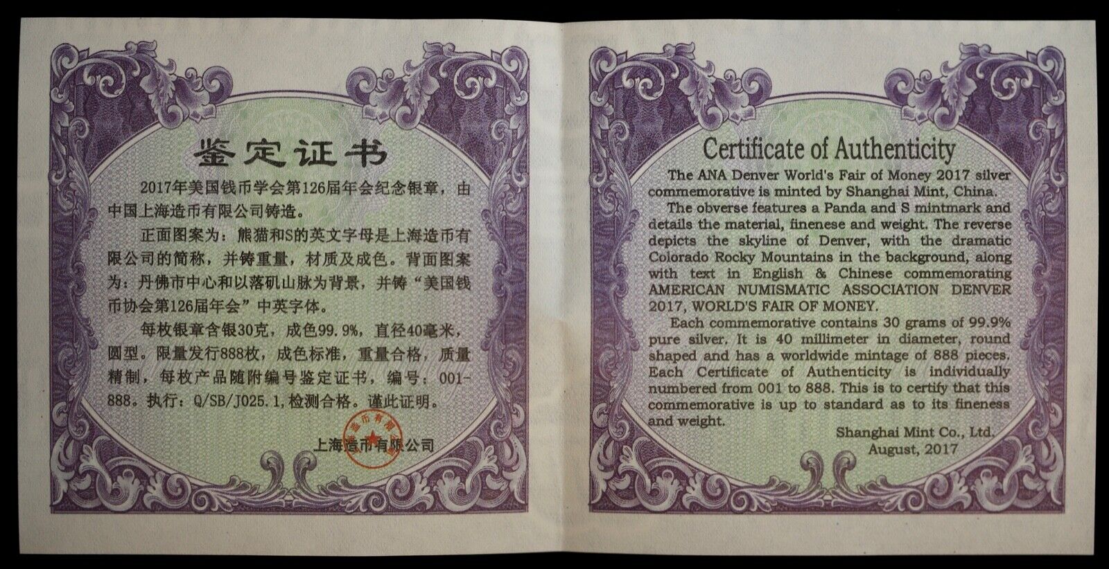 2017 Denver, CO World's Fair of Money ANA 30 Gram Silver Panda Numismatic Assoc