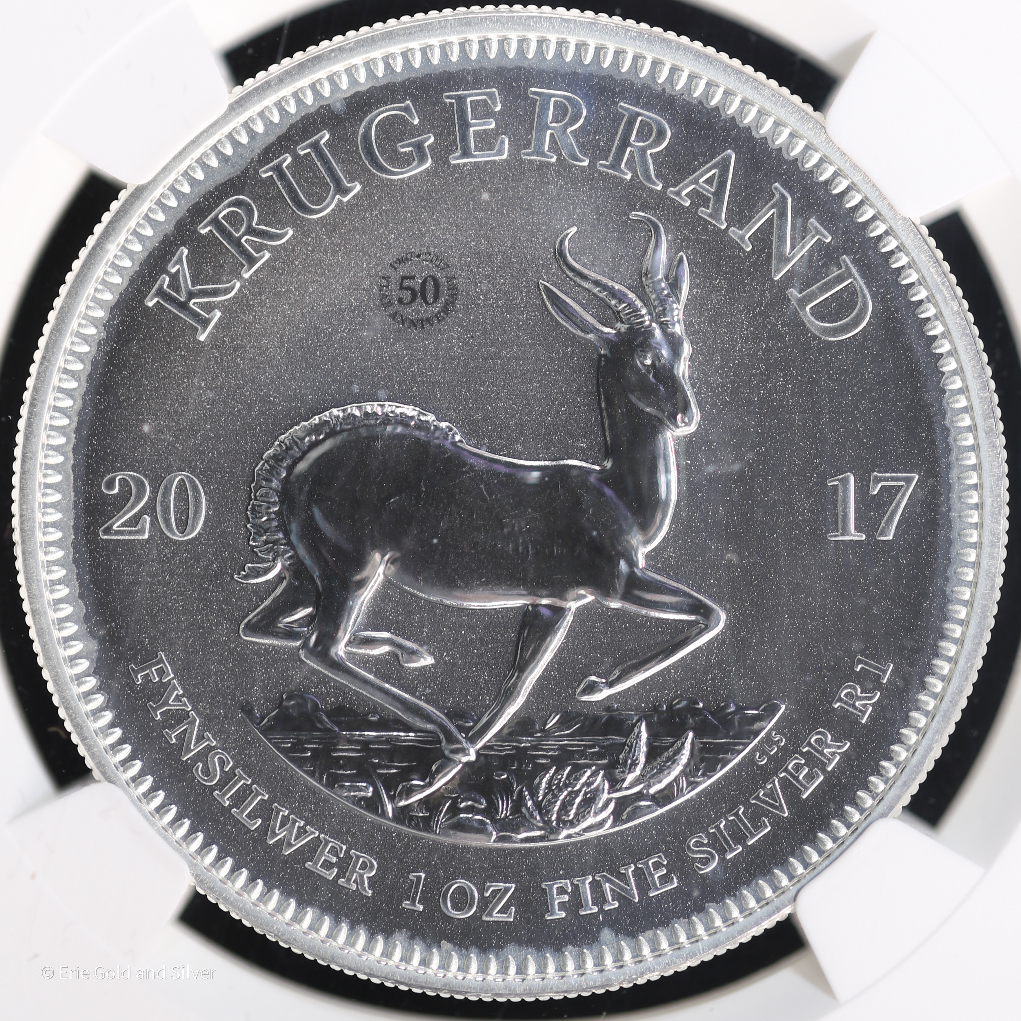For sale is a 2017 South Africa 1 oz Silver Krugerrand, First Day of Issue, 50th Anniversary. Graded / Certified by NGC at SP 70.