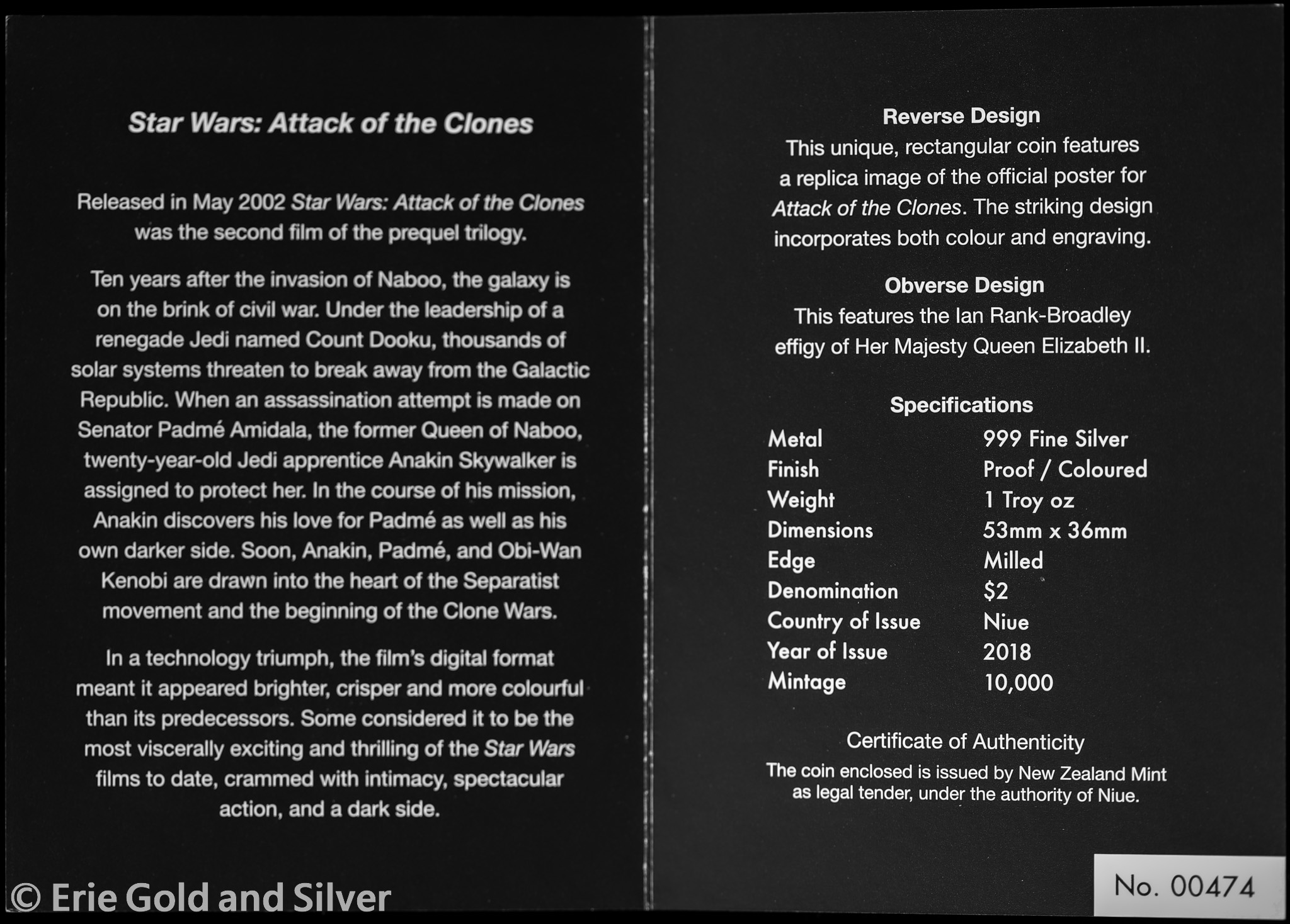 For sale is a 2018 Niue Star Wars Attack of the Clones 1 oz Silver Proof Colorized Coin in OGP.